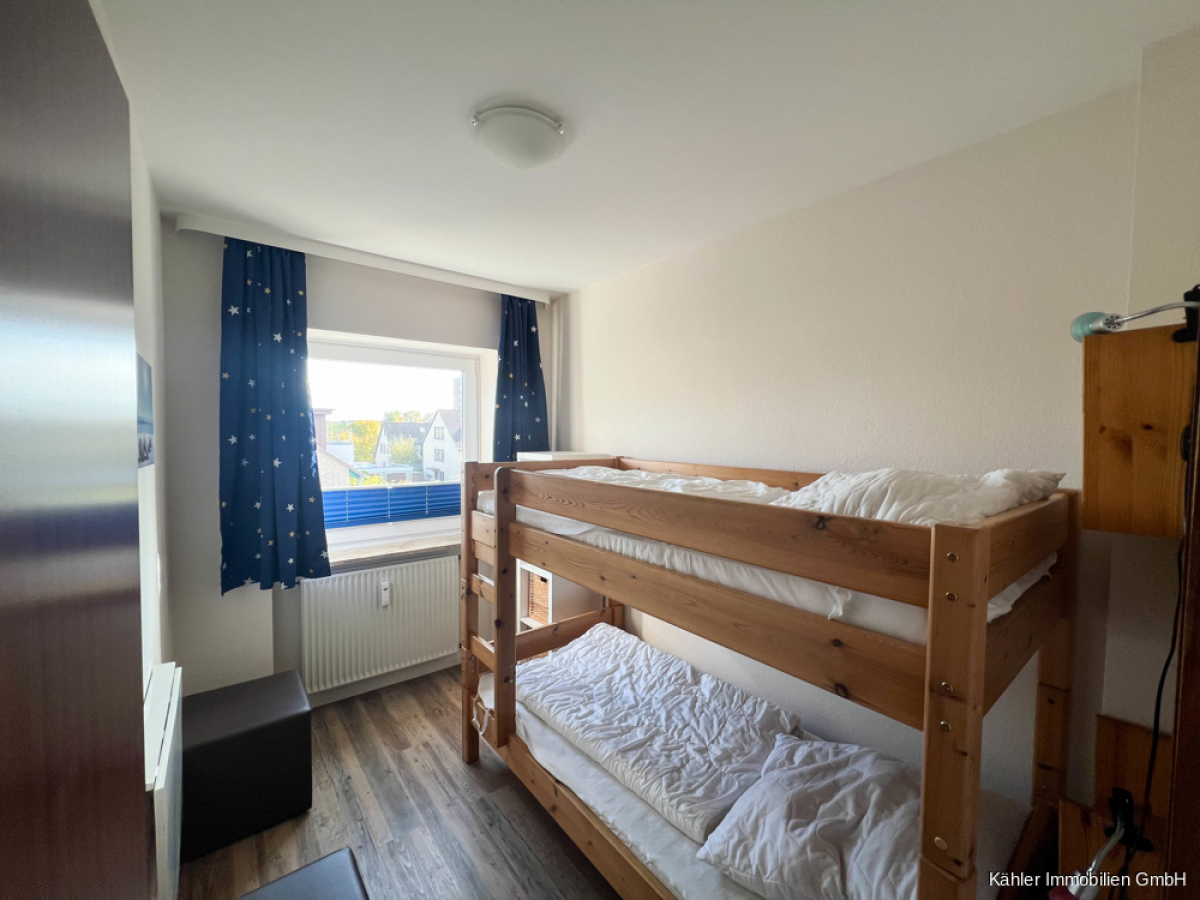 Die Wohnung bietet im Eingangsbereich einen geräumigen Flur mit Platz für einen großen Kleiderschrank. Das helle Wohnzimmer besitzt einen Ess-/Wohnbereich und einen Zugang zu dem großzügigen, sonnigen Südbalkon. Das Fenster und die Tür zum Balkon sind mit elektrischen Außenjalousien versehen. Des Weiteren verfügt die Wohnung über eine separate Küche, die mit sämtlichen Geräten ausgestattet ist und ein helles Tageslichtduschbad. Ein Schlafzimmer bietet ein Doppelbett und ein Dachflächenfenster mit einer elektrische Außenjalousie. Im zweiten Schlafzimmer befindet sich ein Etagenbett und ein klappbarer Tisch zum Malen und Basteln für Kinder.
