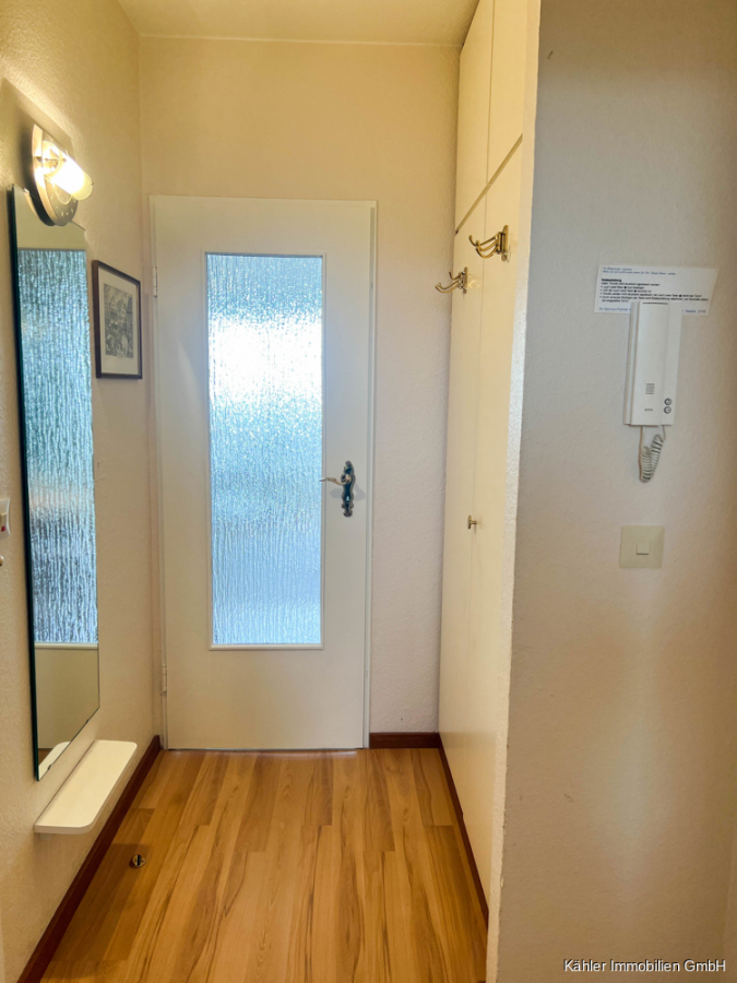 Über das Treppenhaus oder den Personenaufzug des Apartmenthauses erreichen Sie den Eingangsbereich der Wohnung in der vierten Etage.
