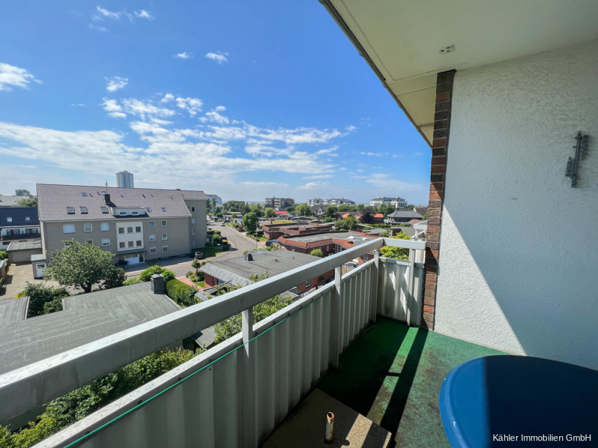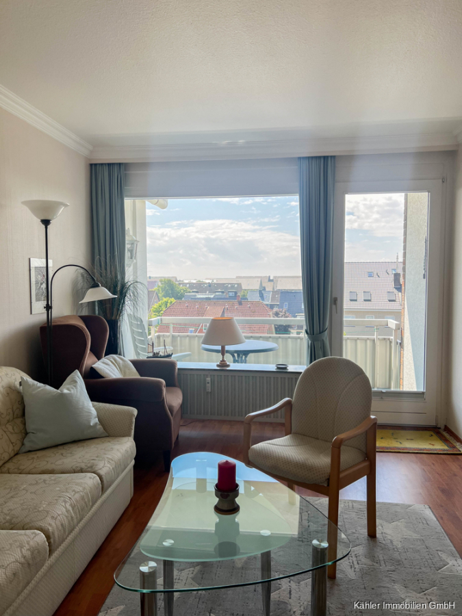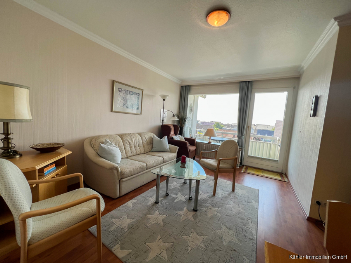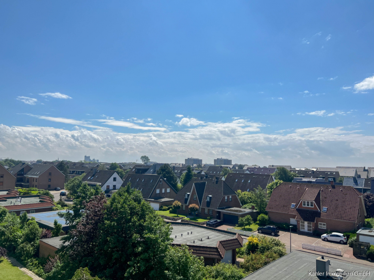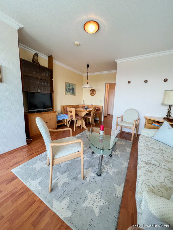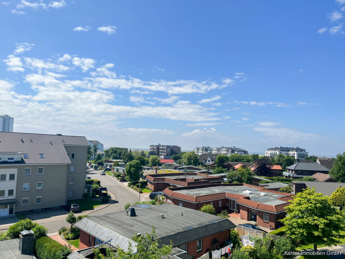Ein ca. 18,35 m² großer Wohn- und Essbereich verfügt ebenfalls über ausreichend Platz. Ein bodentiefes Fensterelement verbindet hier den Wohnbereich mit dem ca. 6,00 m² großen sonnig gelegenen Südbalkon mit Blick bis zur Nordsee.