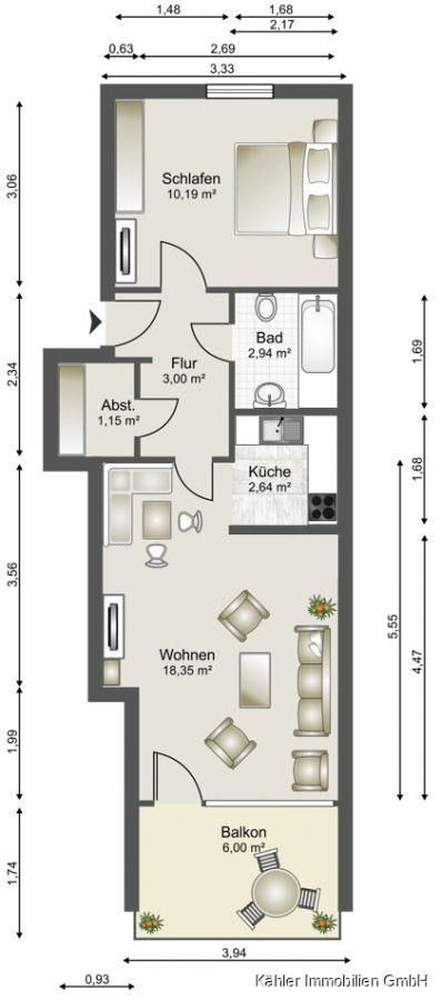 Auf insgesamt ca. 40,29 m² Wohnfläche bietet Ihnen die Wohnung ein komfortables Schlafzimmer sowie ein gepflegtes Wannenbad.