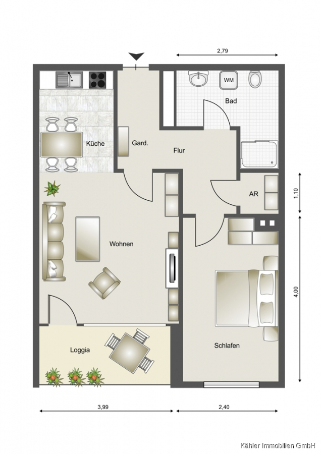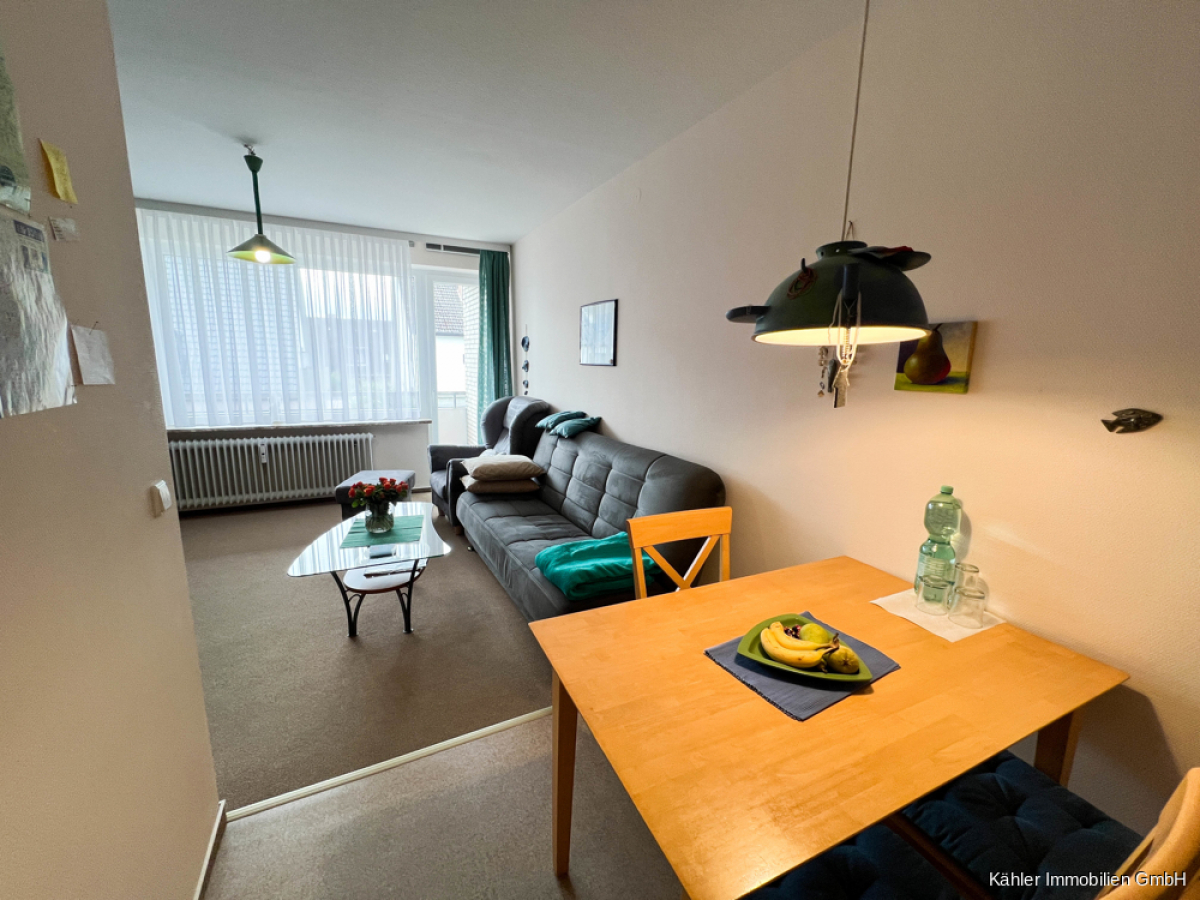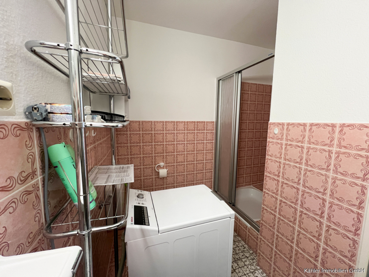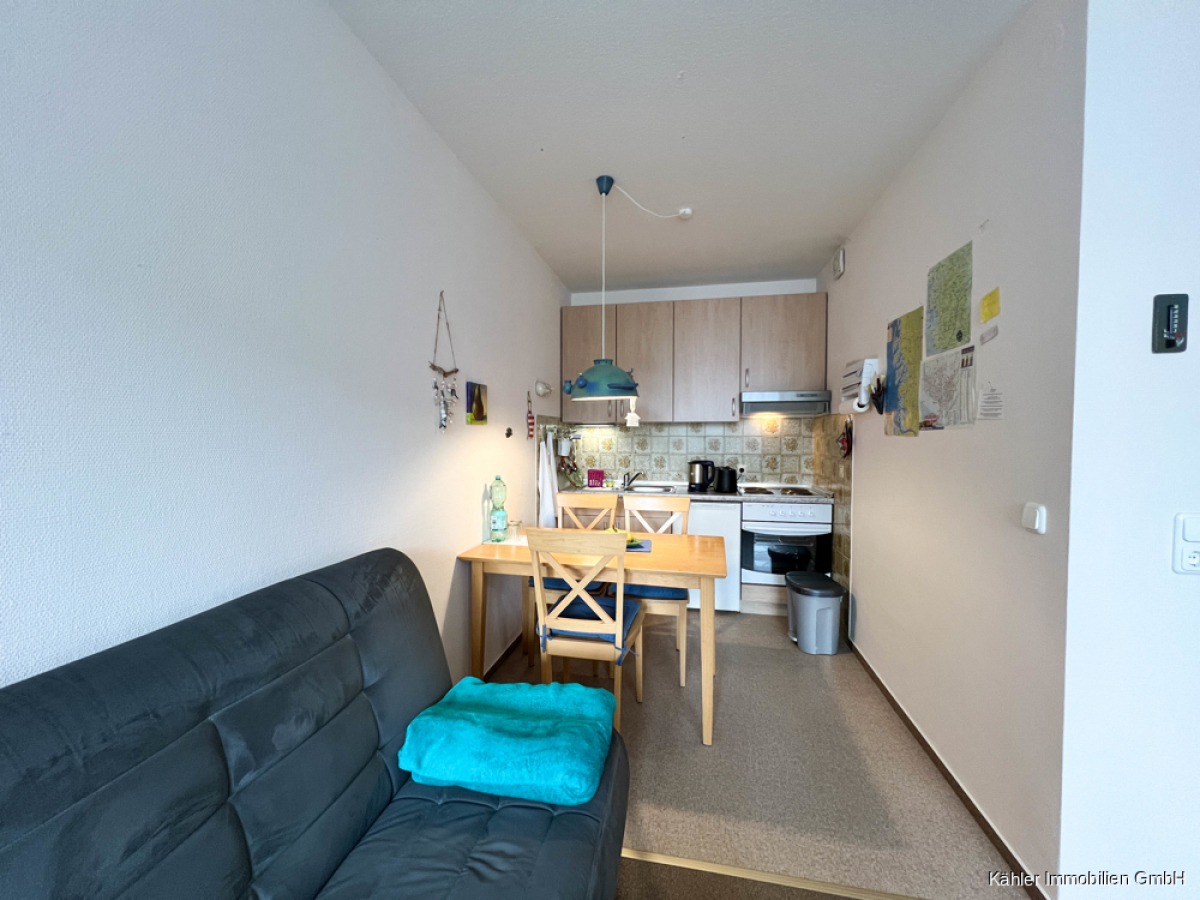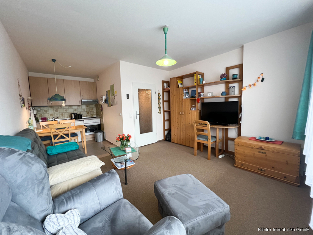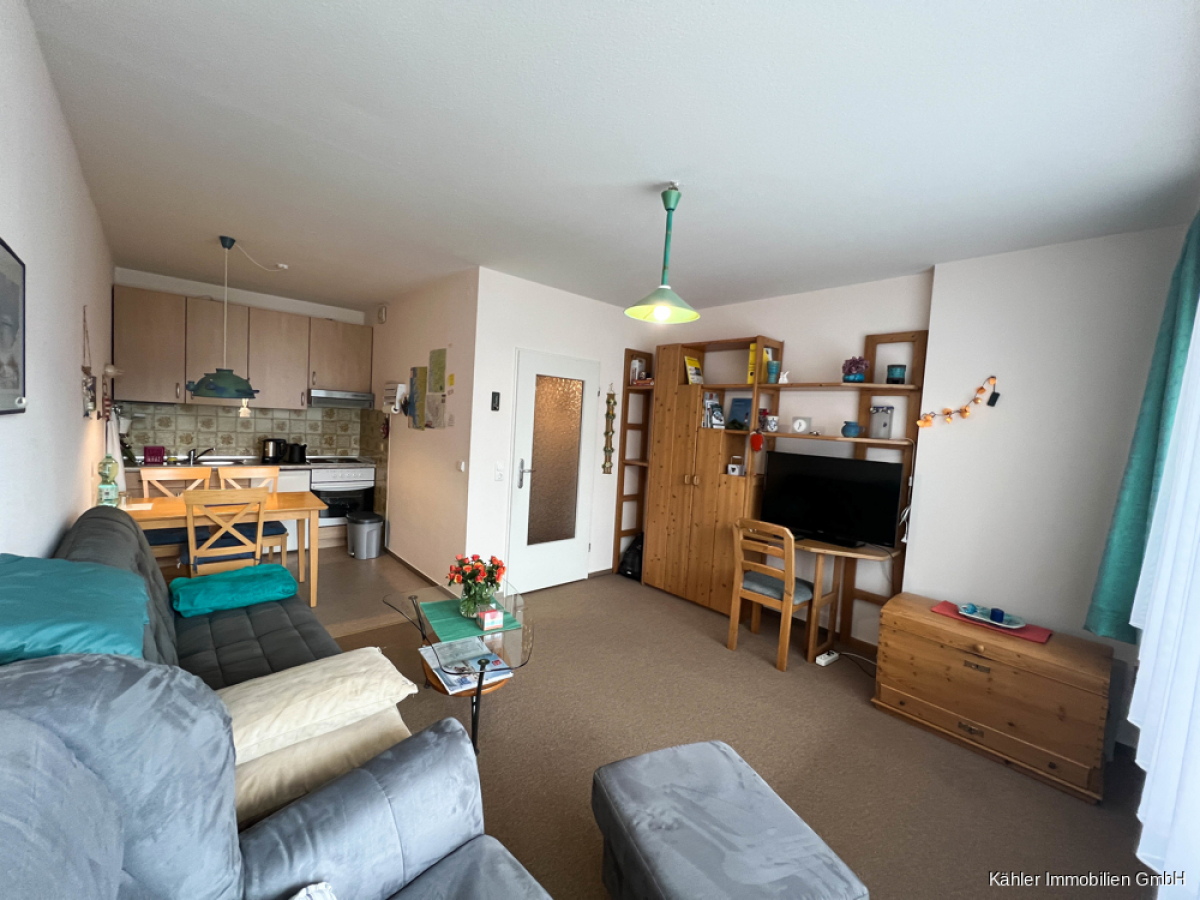 Über ein gemeinsames Treppenhaus gelangen Sie in den 1. Stock des Gebäudes. Durch die Eingangstür treten Sie in den Flur, der ausreichend Platz für eine Garderobe bietet. Von hier aus gelangen Sie in das helle Wohnzimmer mit einer offenen Küche und Zugang zu einer sonnigen Südwestloggia. Das geräumige Schlafzimmer bietet Platz für ein großes Doppelbett und einen Kleiderschrank. Ein weiterer Raum, der Ihnen Abstellmöglichkeiten bietet, sowie ein Duschbadezimmer mit Waschmaschine runden das Angebot ab.