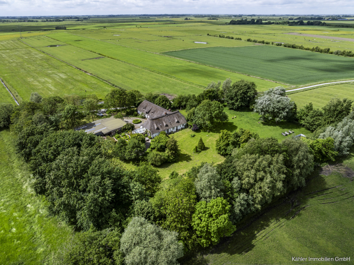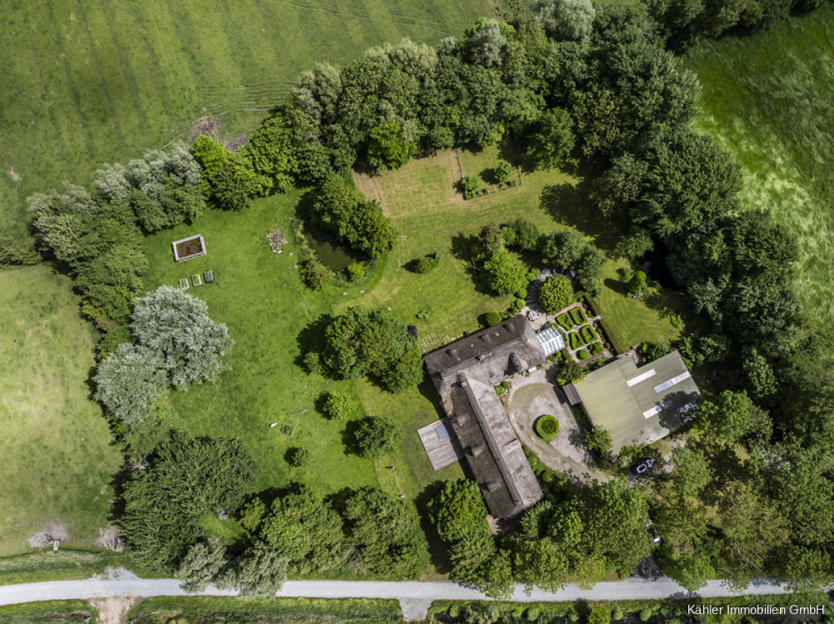 Bereits die Ankunft ist ein Erlebnis: Über eine imposante Auffahrt, die sich sanft den Hügel hinauf zur Warft zieht, empfängt Sie dieses außergewöhnliche Anwesen in Alleinlage.