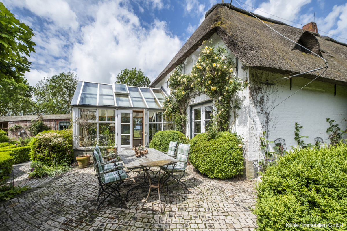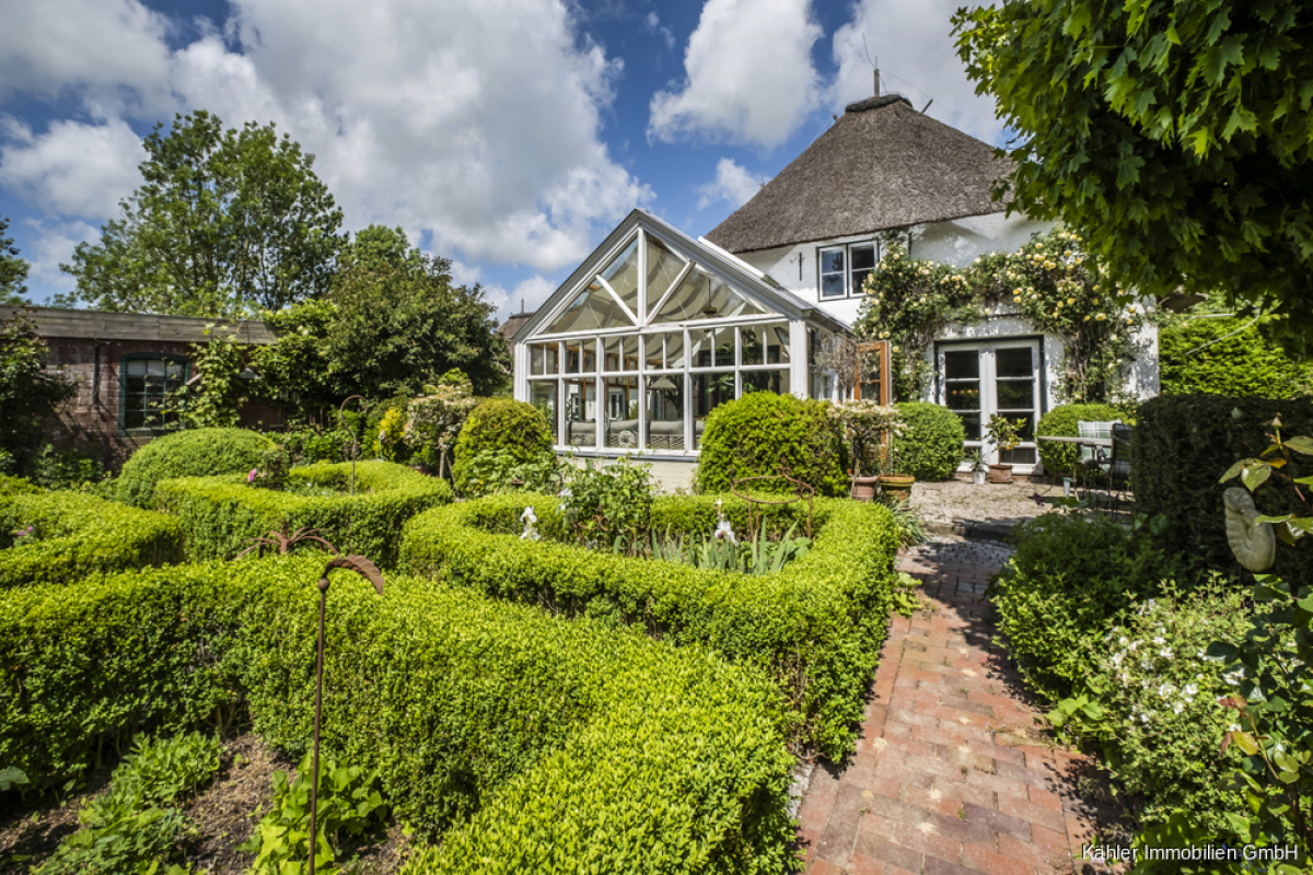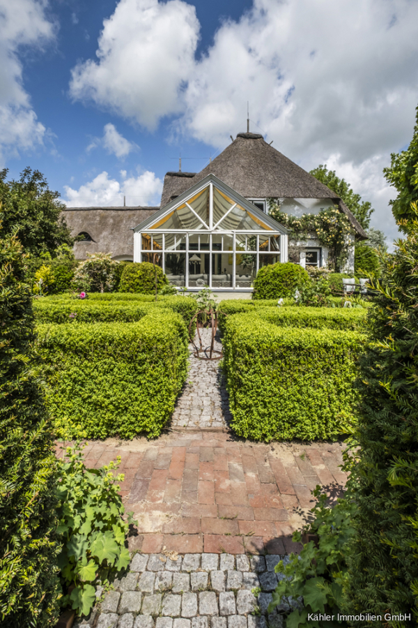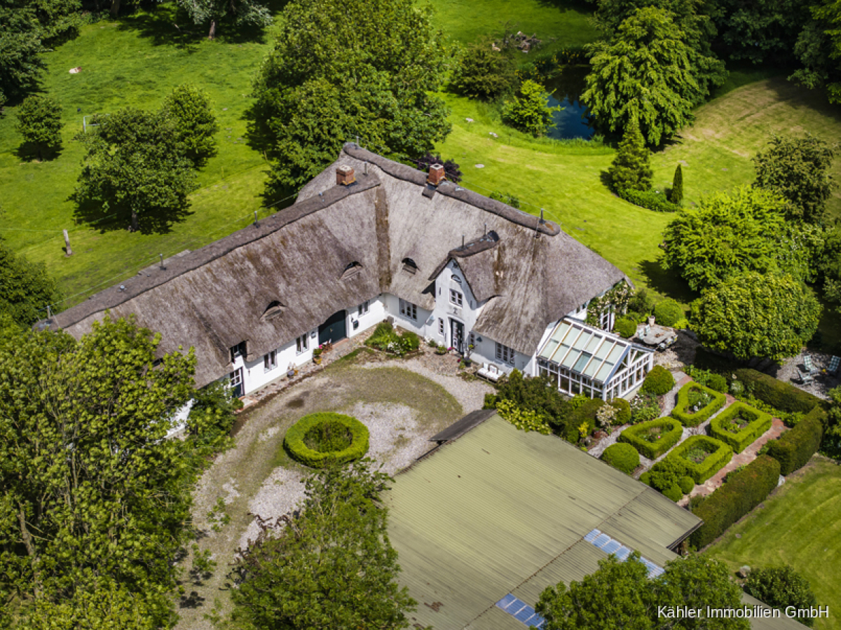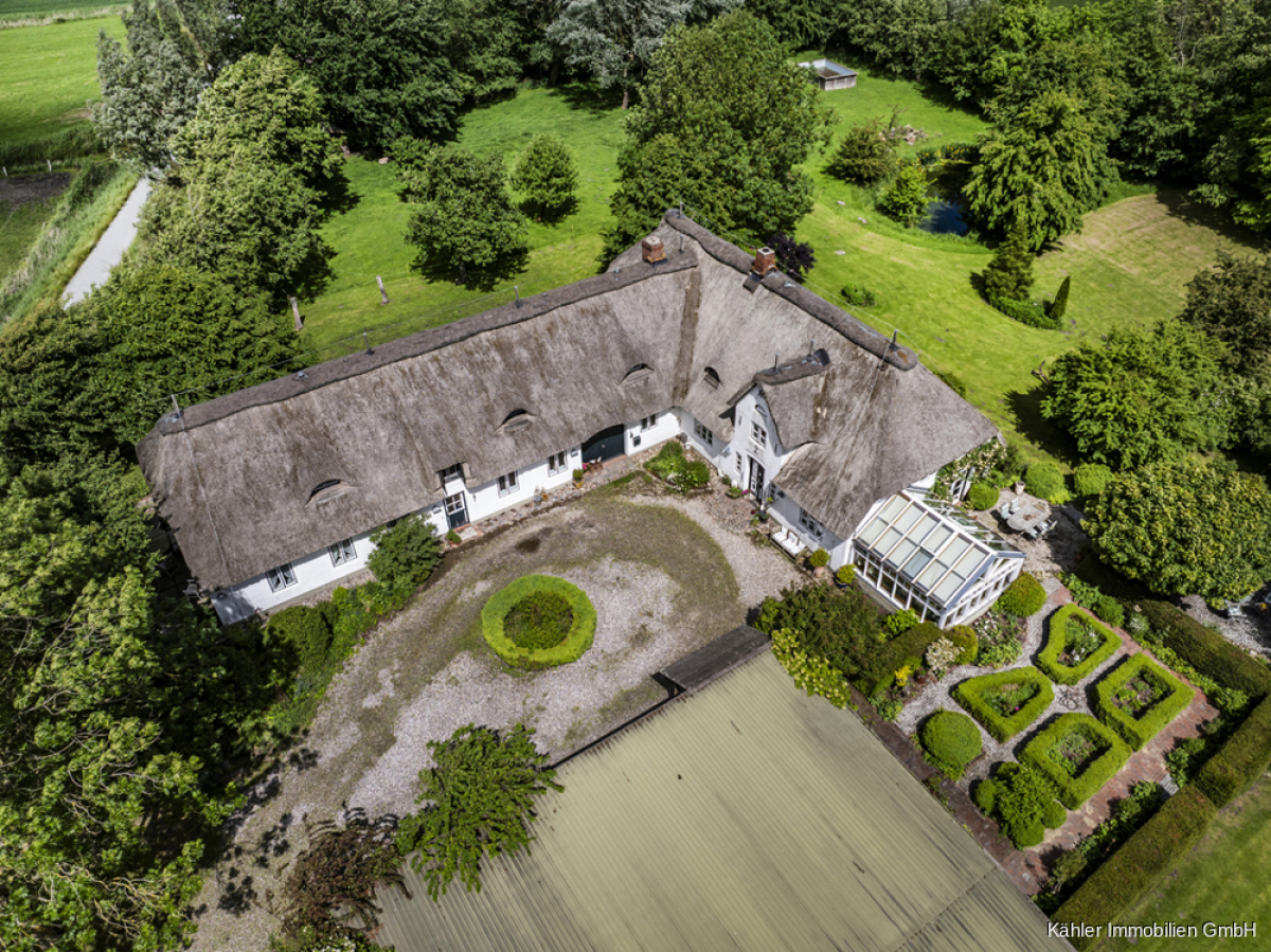Das L-förmig angelegte Reetdachhaus besticht durch klassische norddeutsche Architektur mit viel Liebe zum Detail. Der weiße Anstrich, die geschwungenen Fledermausgauben im Dachgeschoss und das üppige Reet verleihen dem Gebäude eine besondere Ausstrahlung – charmant, einladend und zeitlos. Es ist ein Haus mit Charakter, das sich harmonisch in die umgebende Landschaft einfügt und dennoch kraftvoll Präsenz zeigt.