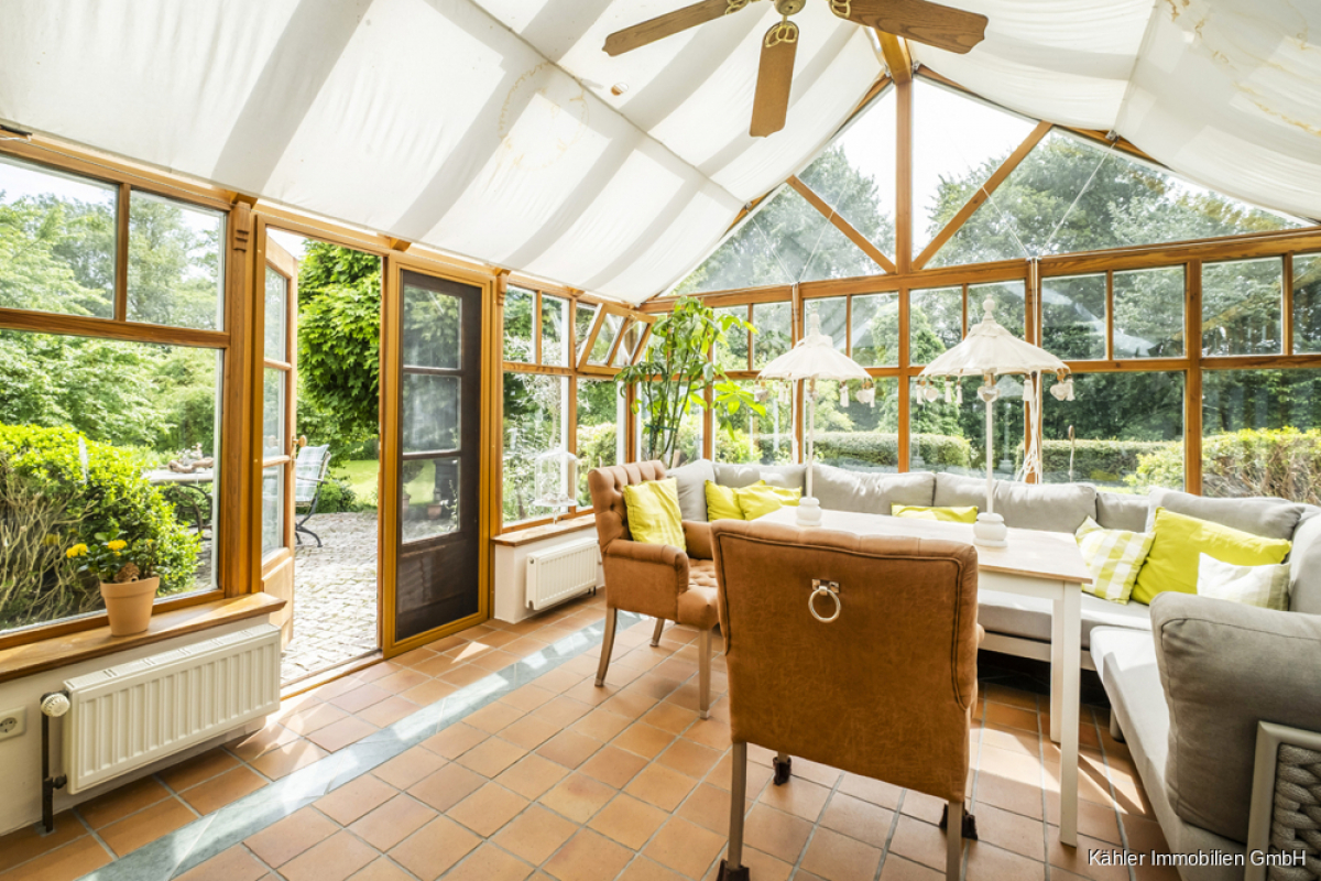 Der vollverglaste Wintergarten mit Blick in den parkähnlich angelegten Garten ist ein Ort der Ruhe und Inspiration, der das ganze Jahr über nutzbar ist.