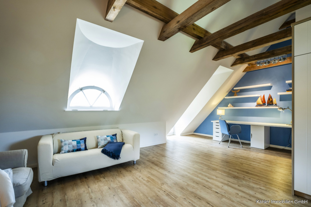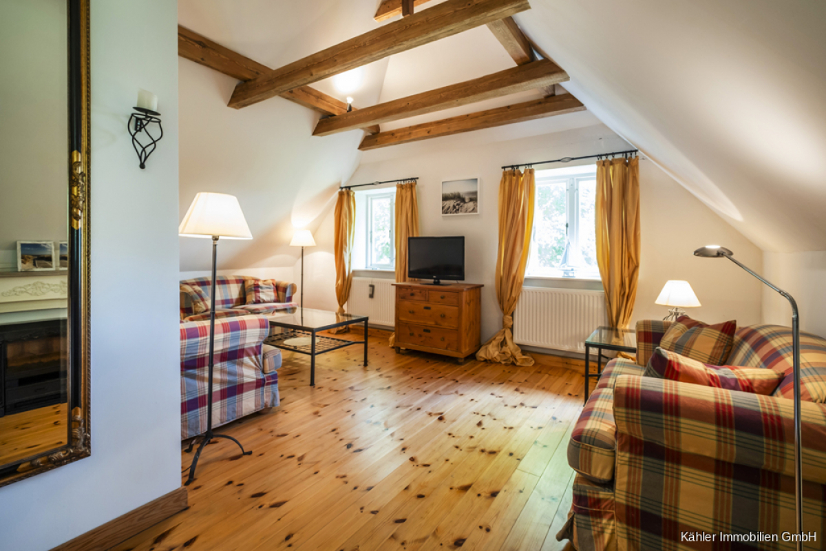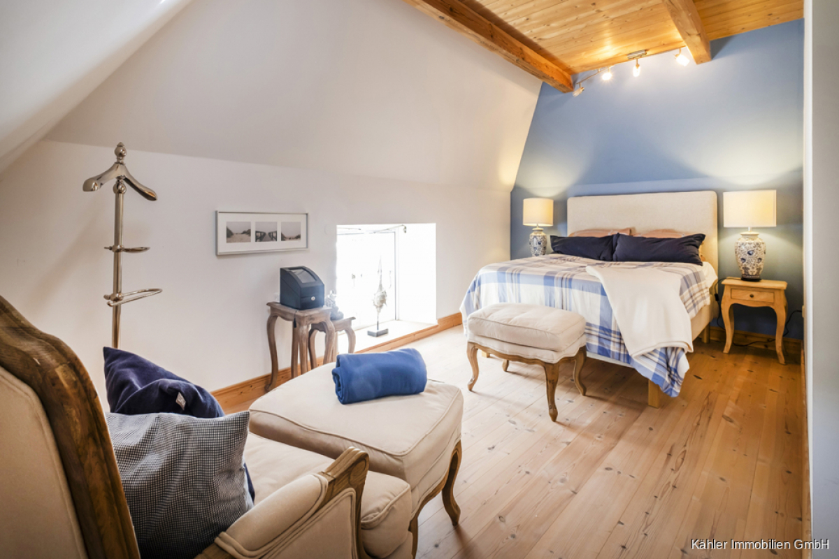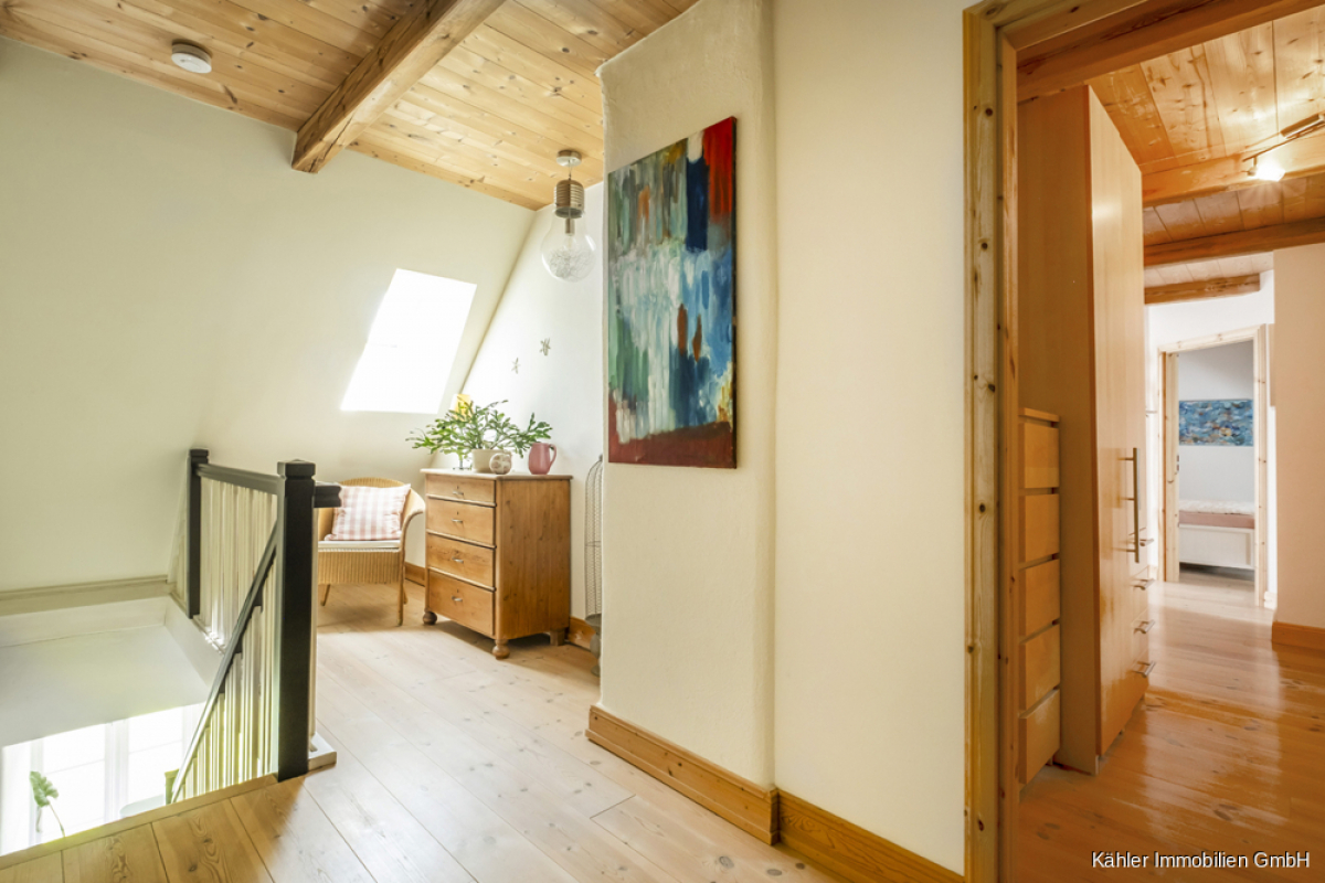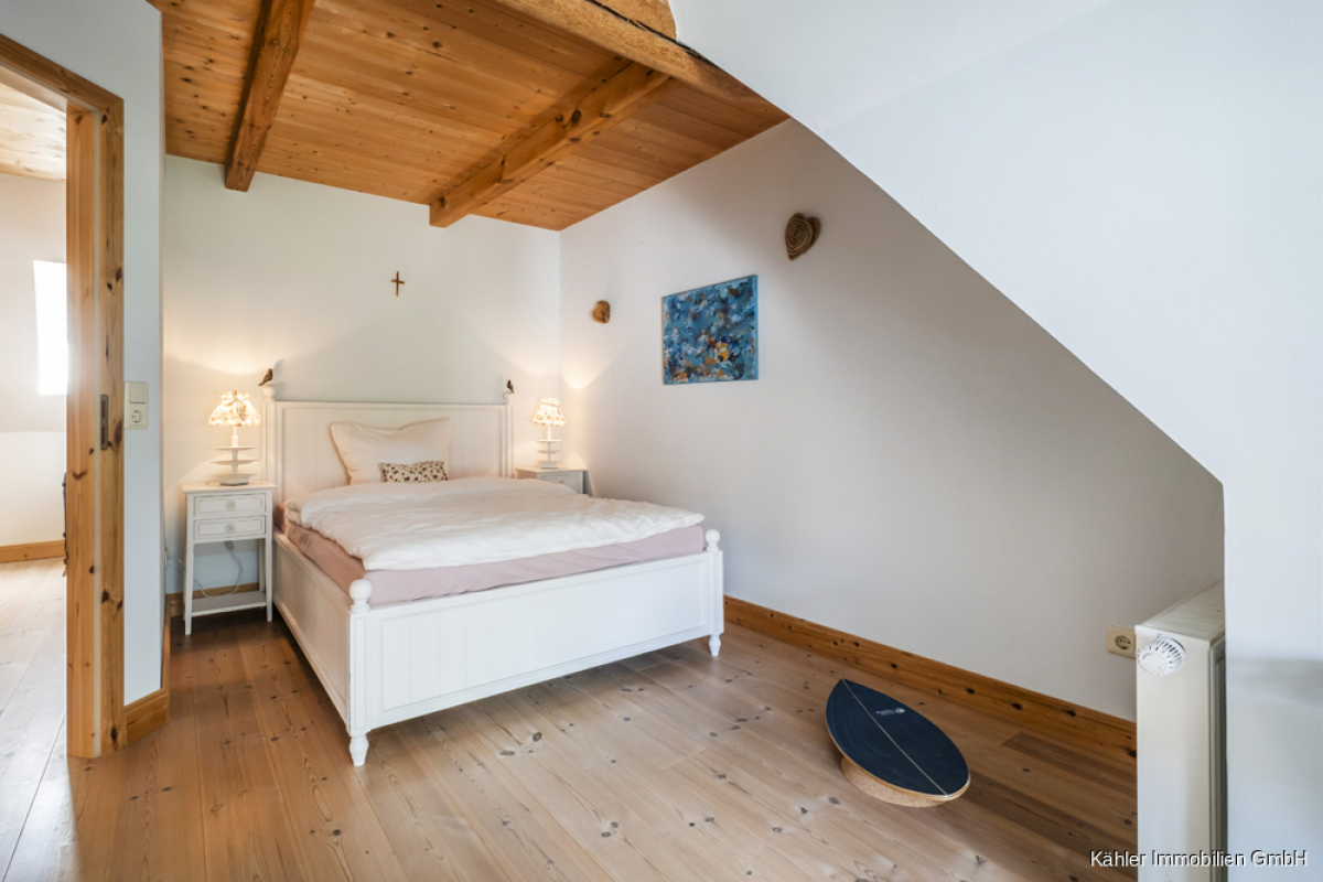 Im Dachgeschoss entfaltet sich die Hauptwohnung weiter: Ein zweites Wohnzimmer mit offener Balkenlage, vier großzügige Schlafzimmer, ein großes Vollbad sowie ein weiteres Duschbad – perfekt für Familie, Gäste oder vielfältige Nutzungsideen.