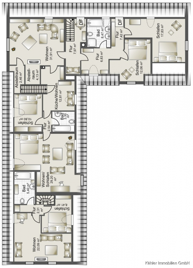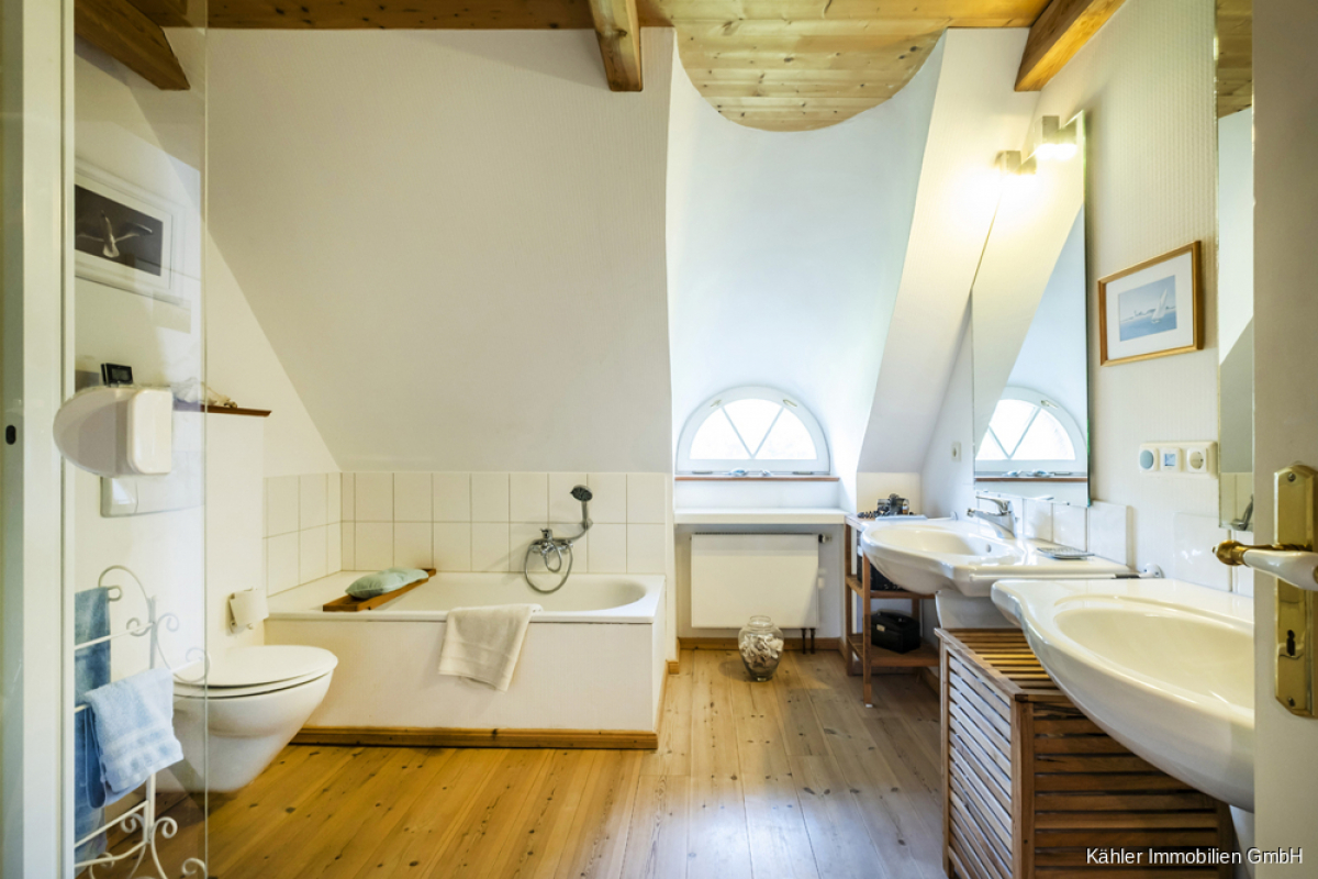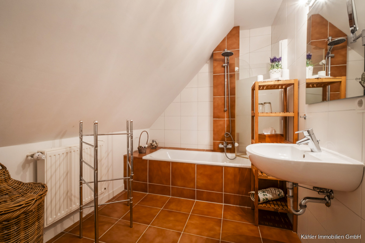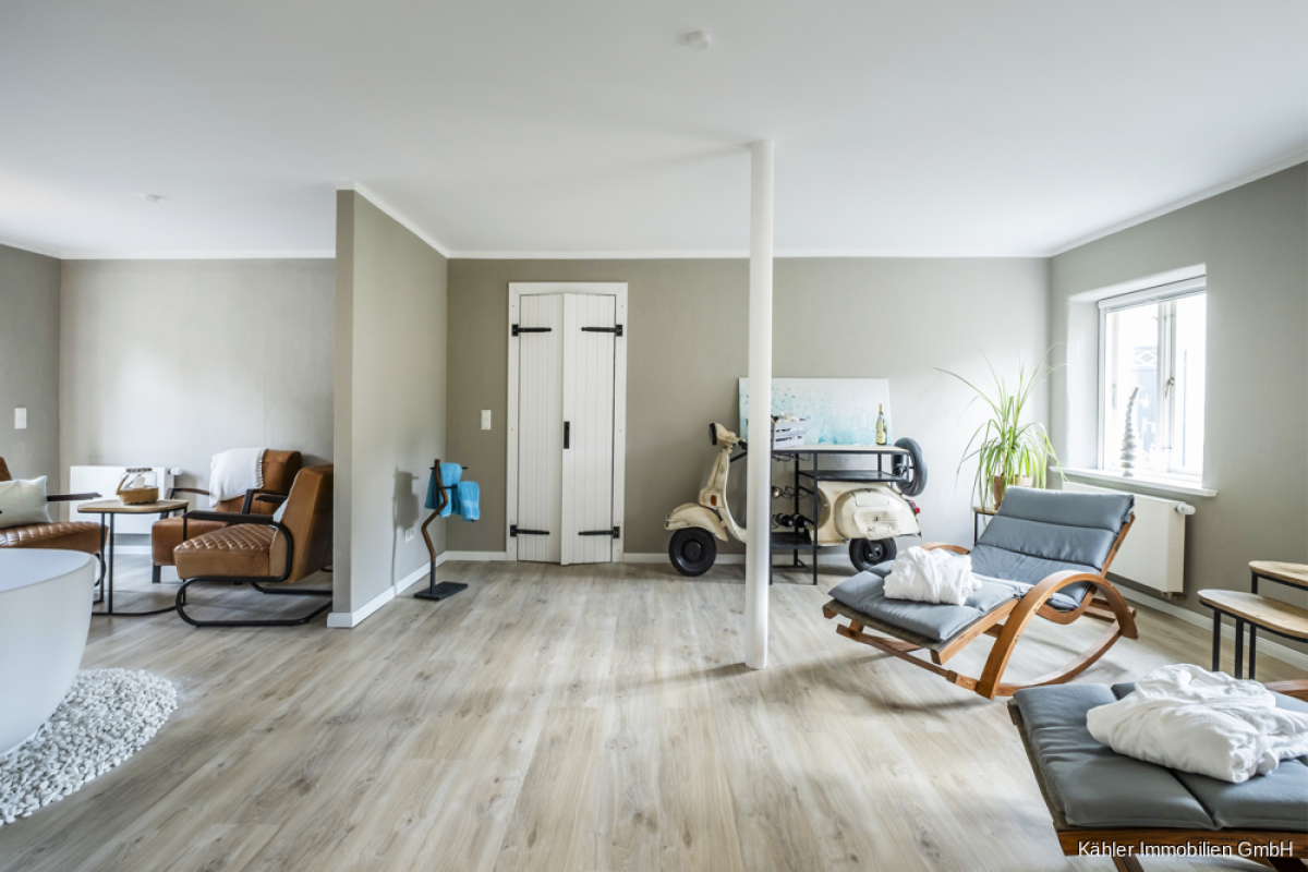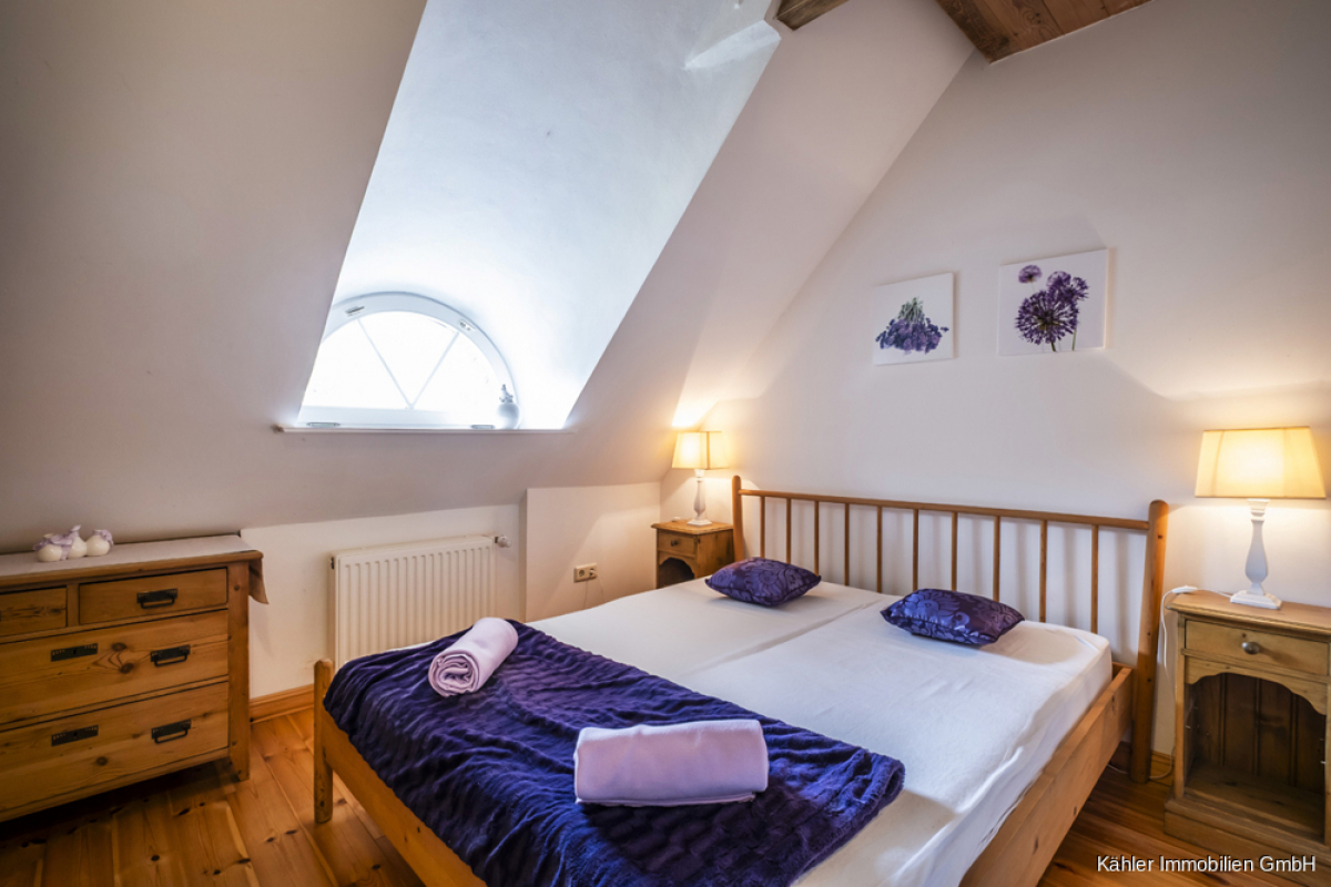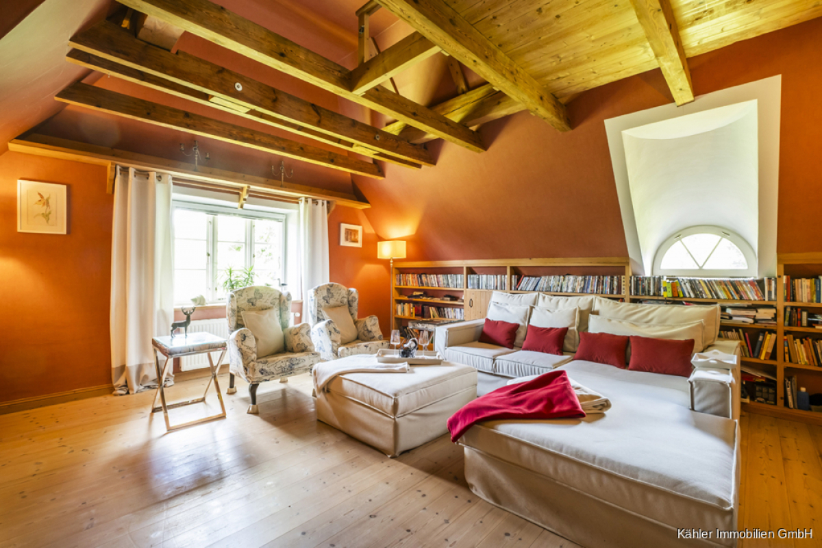 Im Dachgeschoss entfaltet sich die Hauptwohnung weiter: Ein zweites Wohnzimmer mit offener Balkenlage, vier großzügige Schlafzimmer, ein großes Vollbad sowie ein weiteres Duschbad – perfekt für Familie, Gäste oder vielfältige Nutzungsideen.