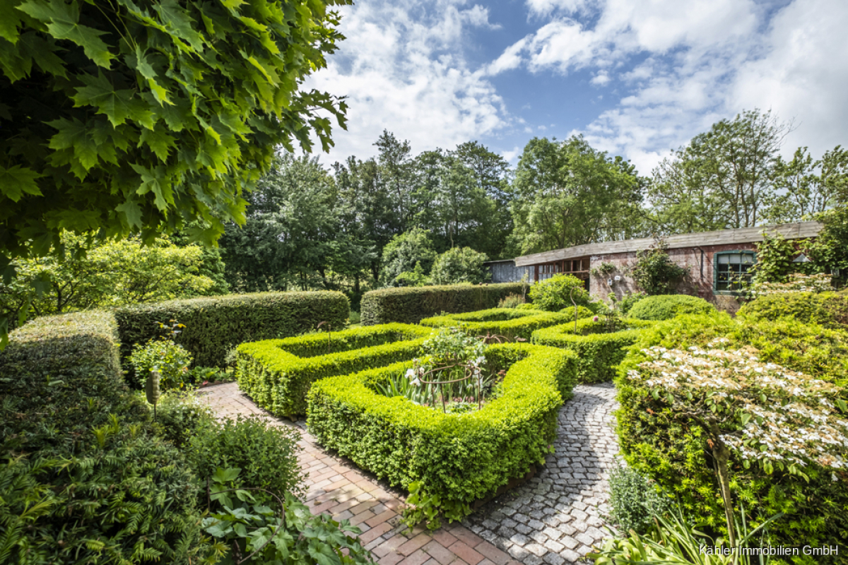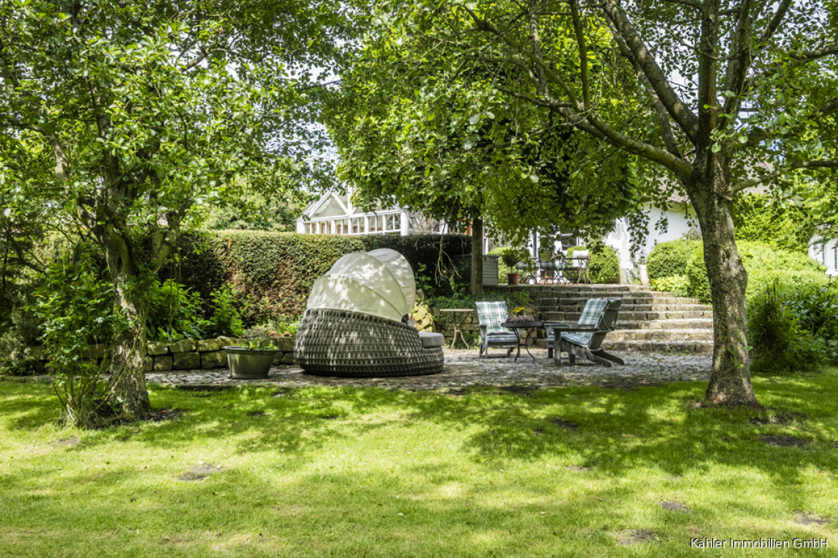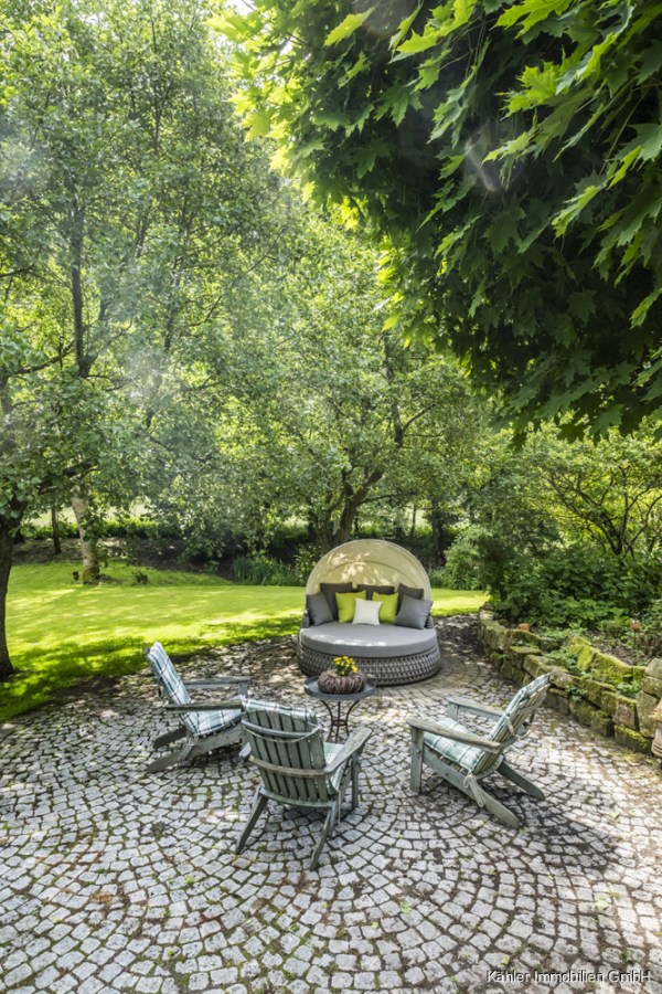 Das ca. 10.818 m² große Grundstück ist parkähnlich angelegt: mit altem Baumbestand, gepflegten Rasenflächen, geschützten Sitzecken und weiten Blickachsen in die Natur.