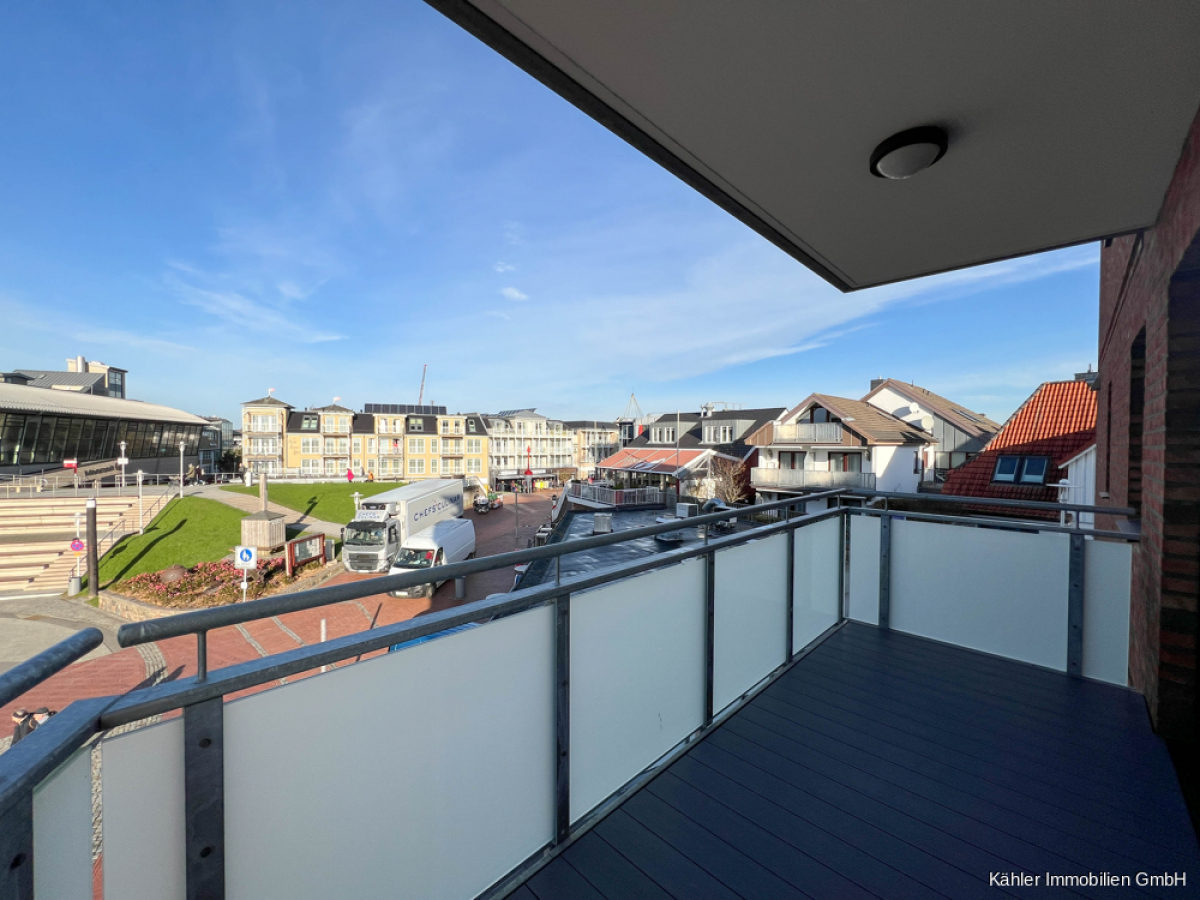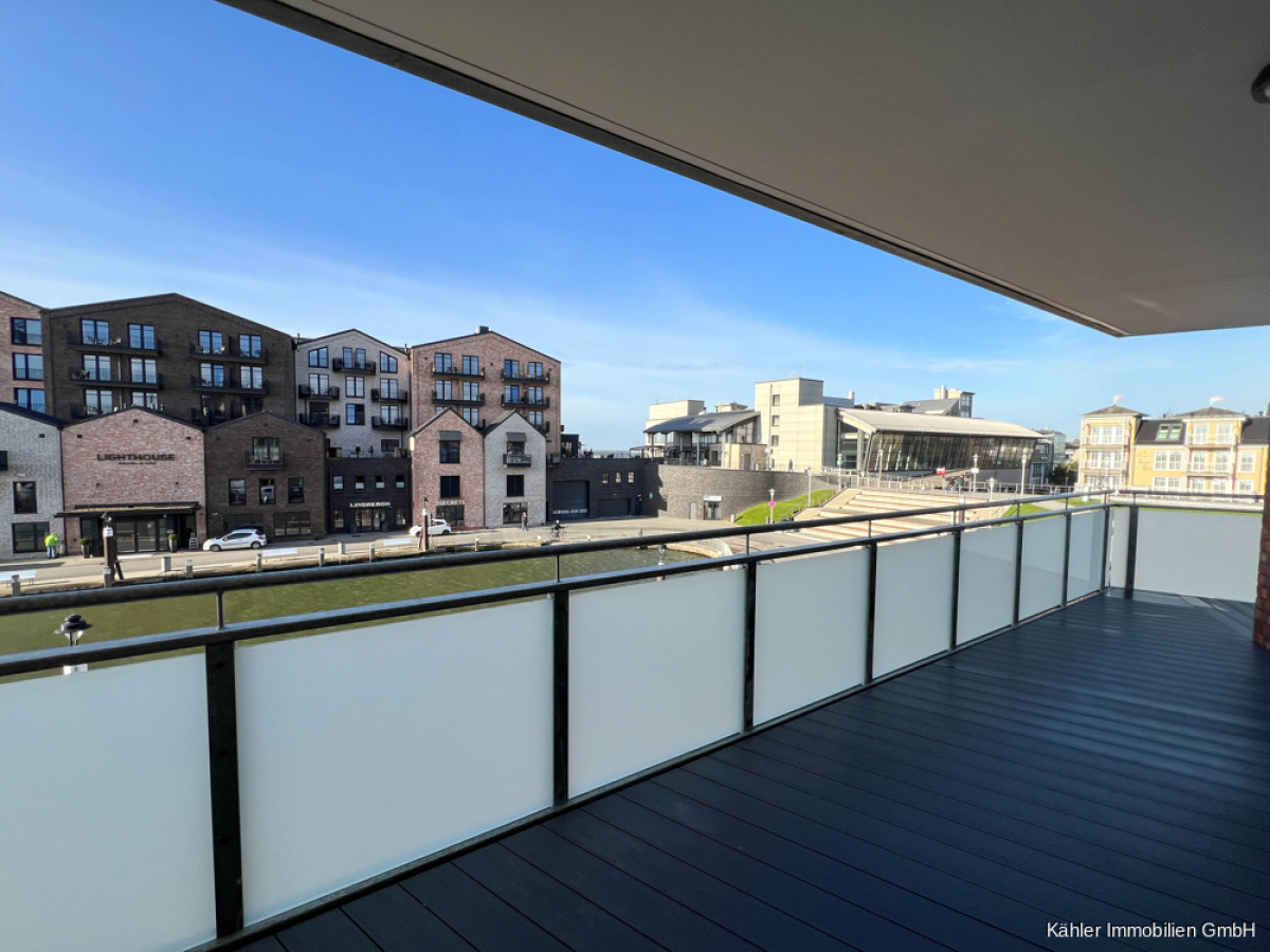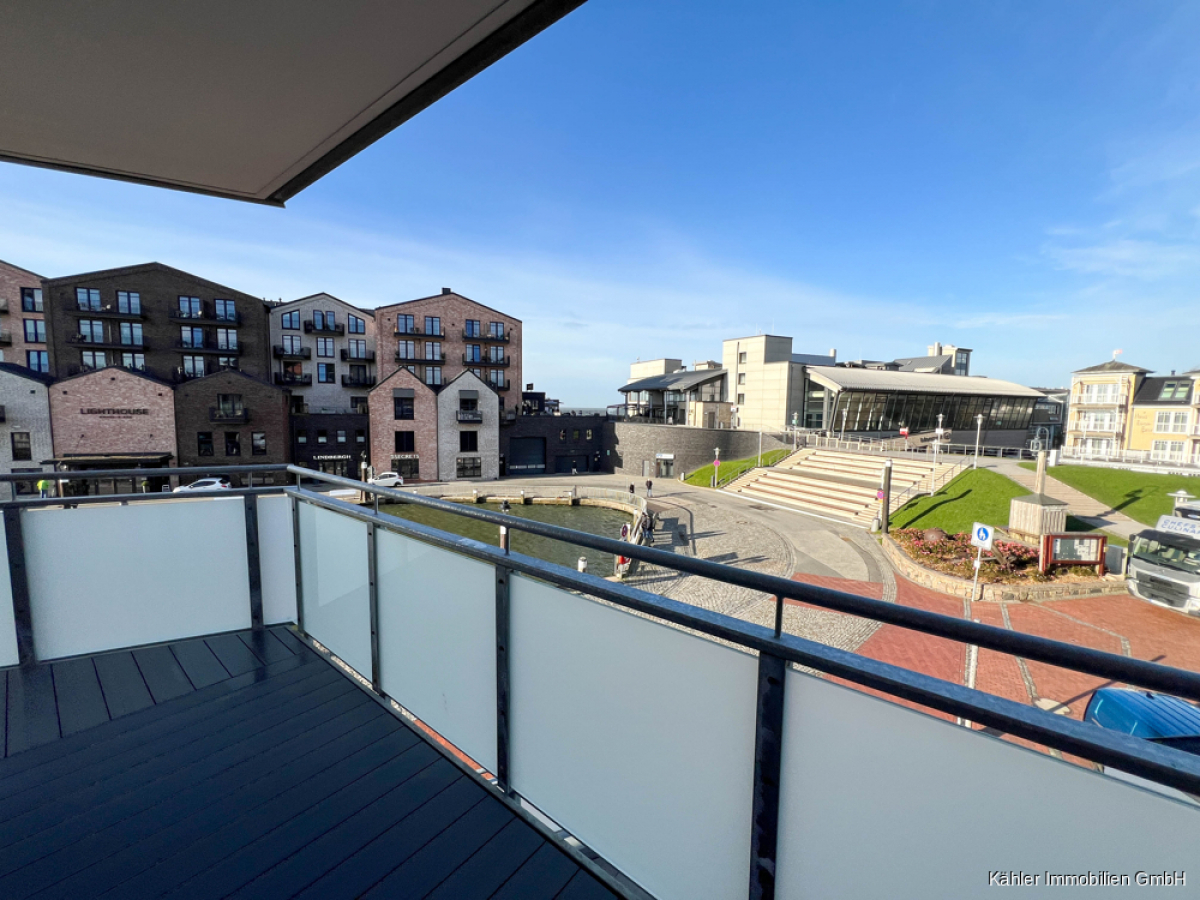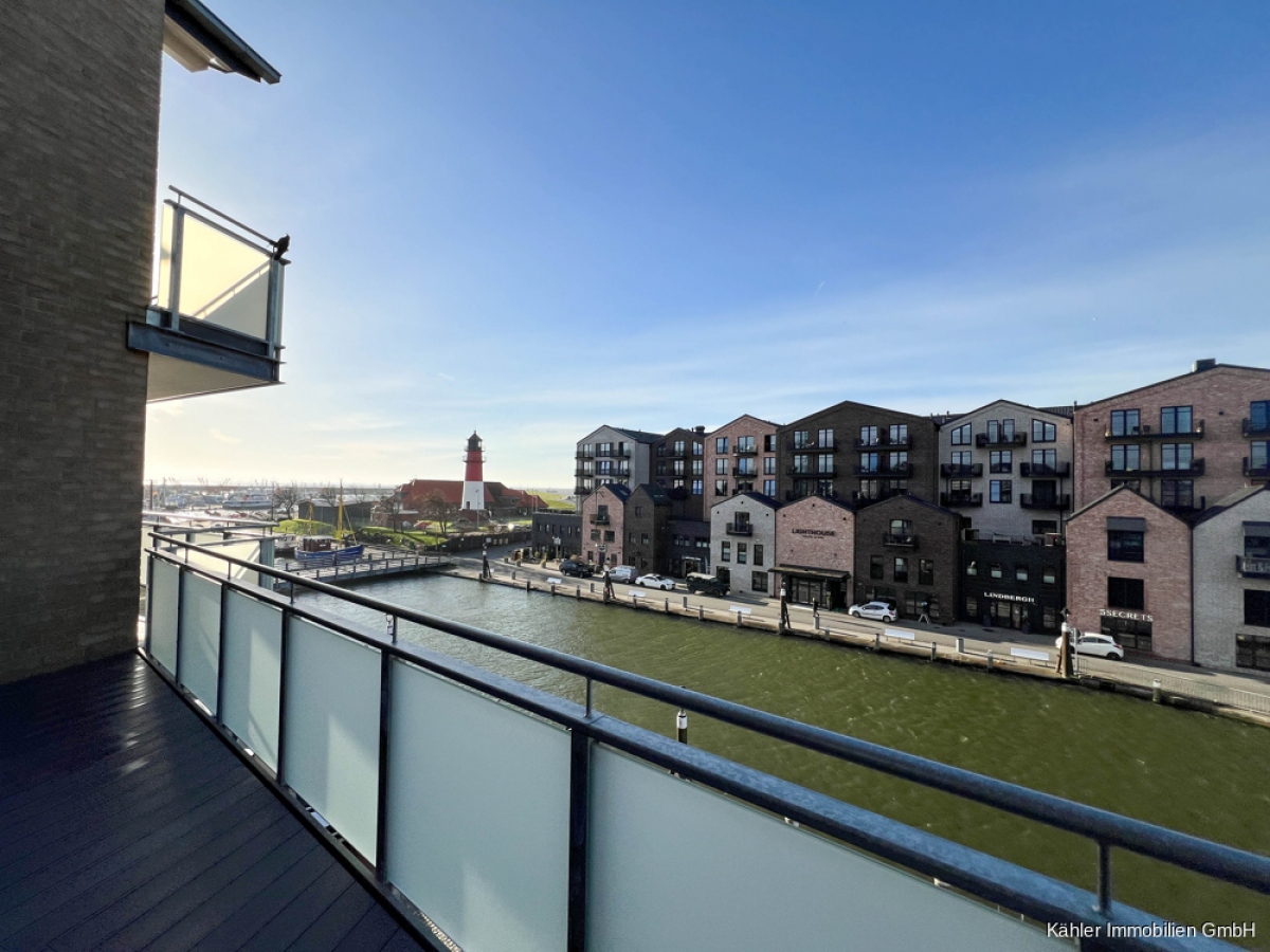 Über drei große Balkontüren gelangt man auf den Südbalkon (ca. 22,44 m²), der einen freien Blick auf das Hafenbecken, die Fischerboote und das geschäftige Treiben bietet – hier erlebt man das maritime Leben aus der ersten Reihe.
