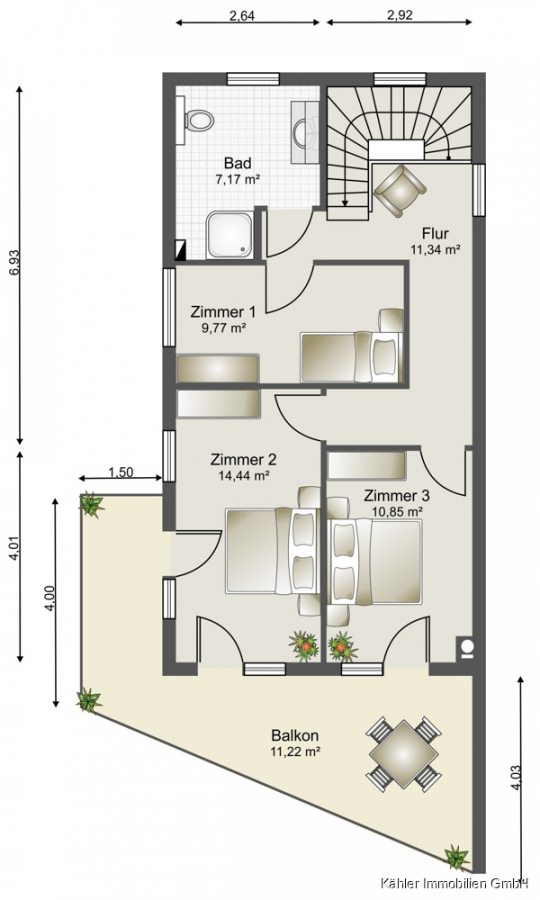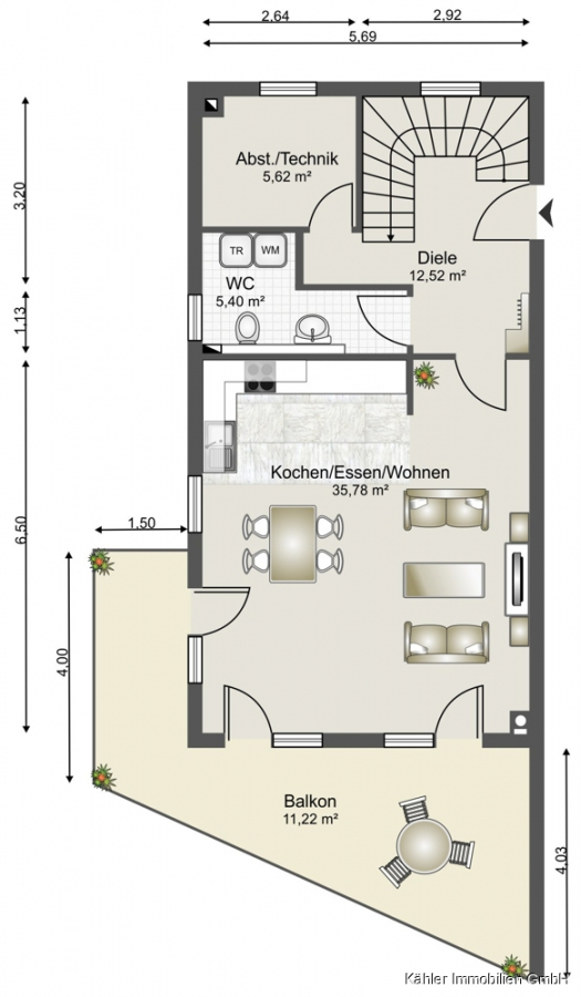 Eine großzügige Diele mit modernem Treppenaufgang verbindet die Etagen miteinander. Auf dieser Ebene befinden sich außerdem ein Gäste-WC mit Waschmaschinen- und Trockneranschluss sowie ein praktischer Abstellraum (ca. 5,62 m²).