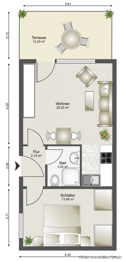 Über einen separaten Eingang erreicht man den großzügigen Flurbereich, welcher alle Räumlichkeiten miteinander verbindet. Auf rund 45 m² Wohnfläche bietet die Wohnung Ihnen eine durchdachte Raumaufteilung mit einem großzügig geschnittenen Wohn- und Essbereich inklusive offener Einbauküche, einem separaten Schlafzimmer sowie einem modernen Duschbad mit Fenster. Vom Wohnbereich aus gelangt man auf die Terrasse in Ostausrichtung, die zu einem sonnigen Frühstück im Freien einlädt und einen angenehmen Blick in das gepflegte Umfeld bietet.