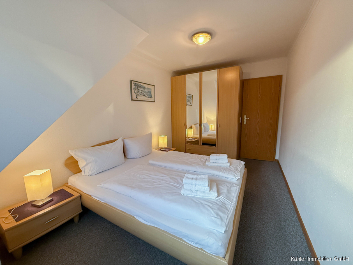Vom Wohnbereich aus gelangt man auf den Balkon in Ostausrichtung, der einen freien Blick über die Umgebung ermöglicht – ideal, um morgens die Sonne zu genießen oder den Tag bei frischer Nordseeluft ausklingen zu lassen. Das Schlafzimmer bietet ausreichend Platz für ein Doppelbett und Schrank und punktet durch seinen ruhigen Zuschnitt. Das Badezimmer verfügt über ein Fenster und ist mit einer Dusche ausgestattet. Ergänzt wird das Raumangebot durch einen praktischen Abstellraum innerhalb der Wohnung, der zusätzlichen Stauraum bietet.
