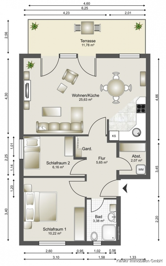 Diese großzügige 2,5-Zimmer-Wohnung verfügt über insgesamt ca. 56,05 m² Wohnfläche und befindet sich im Erdgeschoss eines Mehrfamilienhauses. In der Wohnfläche enthalten sind 25 Prozent (2,94 m²) der Terrasse.