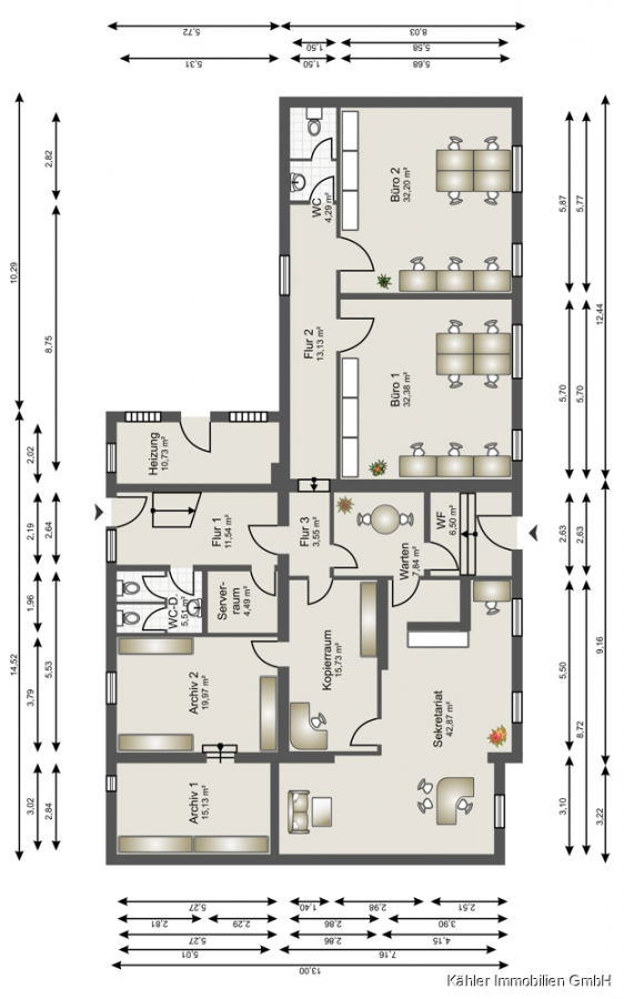 Die Fläche im Erdgeschoss verfügt über insgesamt 226,36 m² Bürofläche aufgeteilt in vier Büroräume, einen großzügigen Empfangsbereich sowie ein separates Wartezimmer. Ein Serverraum, ein Mitarbeiter-WC sowie ein Gäste-WC runden das Angebot Im Erdgeschoss ab. Weiterhin befindet sich im Obergeschoss eine Pantryküche zur gemeinschaftlichen Nutzung. Die Flure verbinden alle Räumlichkeiten miteinander.