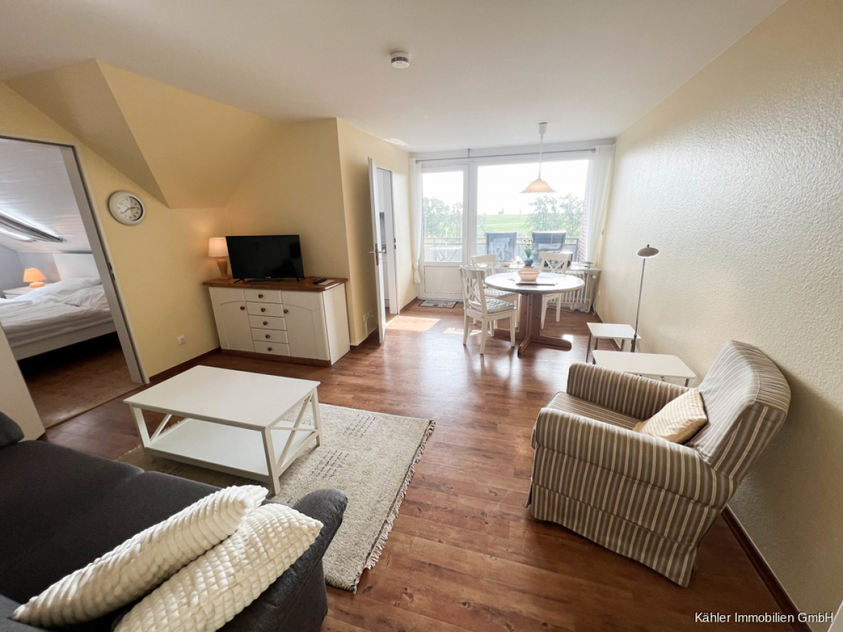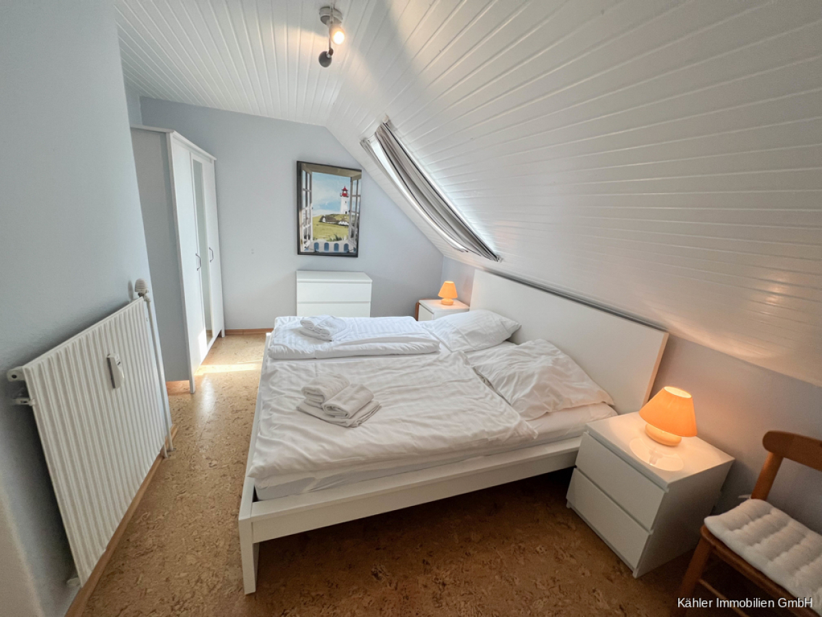 Die Dachgeschosswohnung im 2. Stock bietet ein helles Wohnzimmer mit Essbereich, eine separate, moderne Küche mit geräumiger Abseite, ein helles Duschbad, einen Abstellraum und ein gemütliches Schlafzimmer. Das Highlight der Wohnung ist die ca. 5,5 m breite nach Süden ausgerichtete Loggia mit einem unverbaubaren Blick über das Weltnaturschutzerbe Wattenmeer.