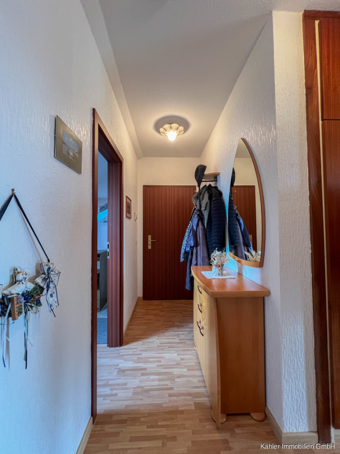 Über das gemeinsame Treppenhaus des Apartmentgebäudes erreichen Sie die Eingangstür der Wohnung im 2.OG. Hier empfängt Sie ein Flur, der einen Einbauschrank bietet und sämtliche Räume verbindet.