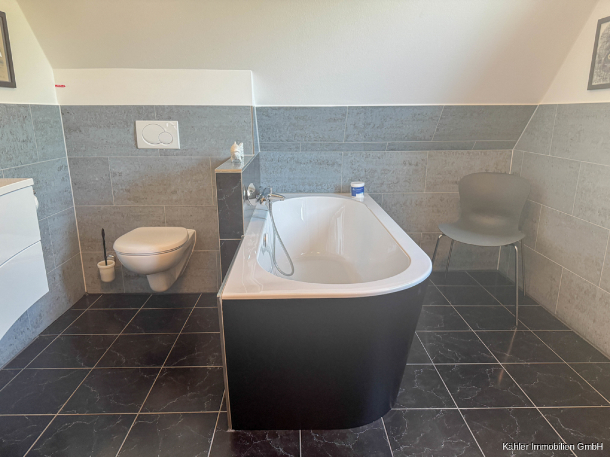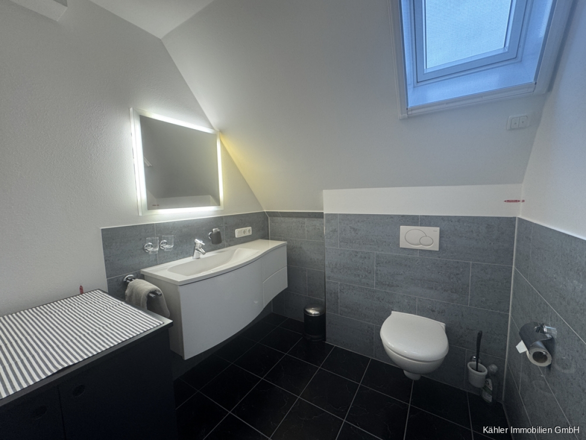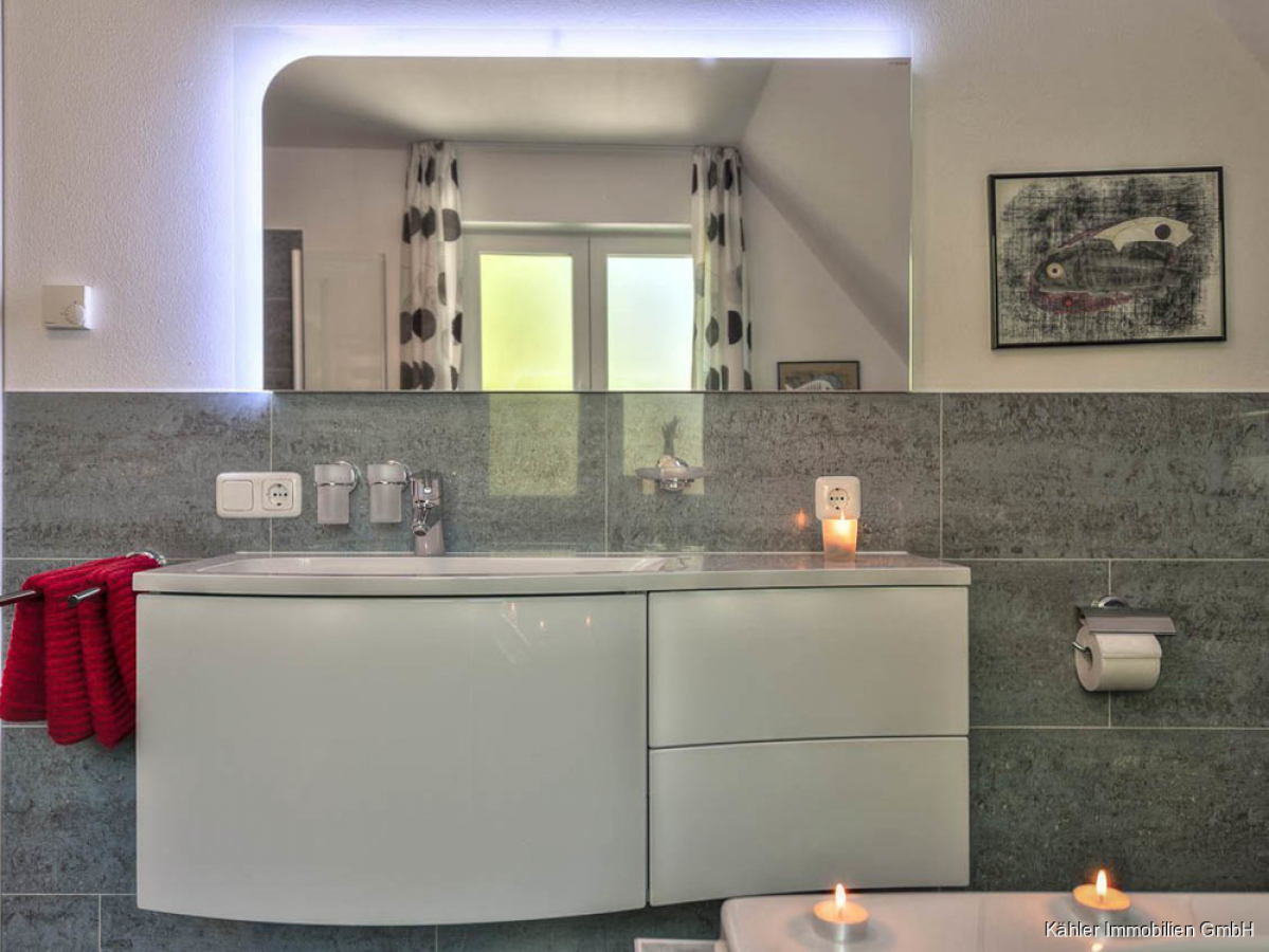 In der Wohnung finden Sie ein großes Badezimmer, sowie ein Gäste-WC. Das Bad verfügt über eine hochwertige Palme-Dusche, eine schwarz-weiße Badewanne, einen Handtuchwärmer, sowie einen geschwungenen Waschtisch von Burgbad. Im Gäste-WC finden Sie einen Waschtrockner.