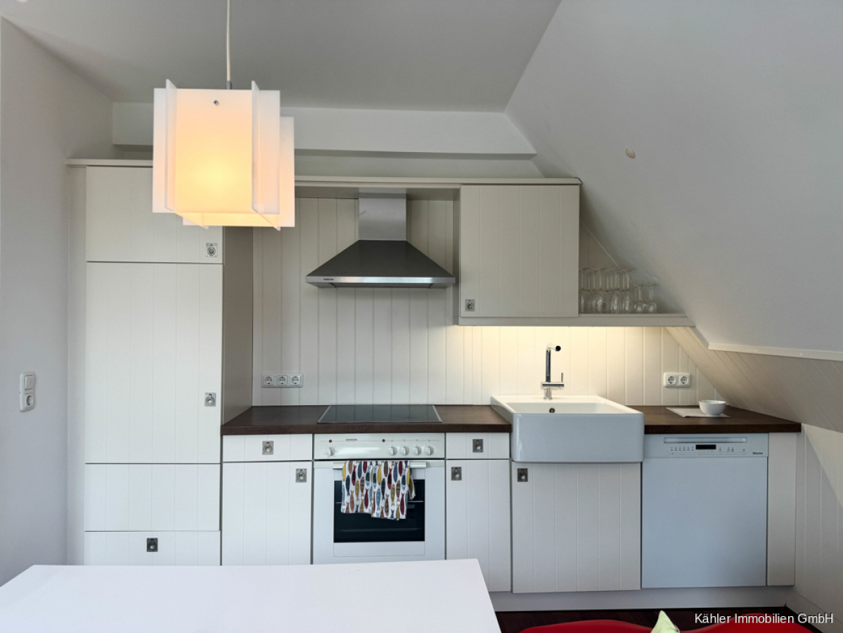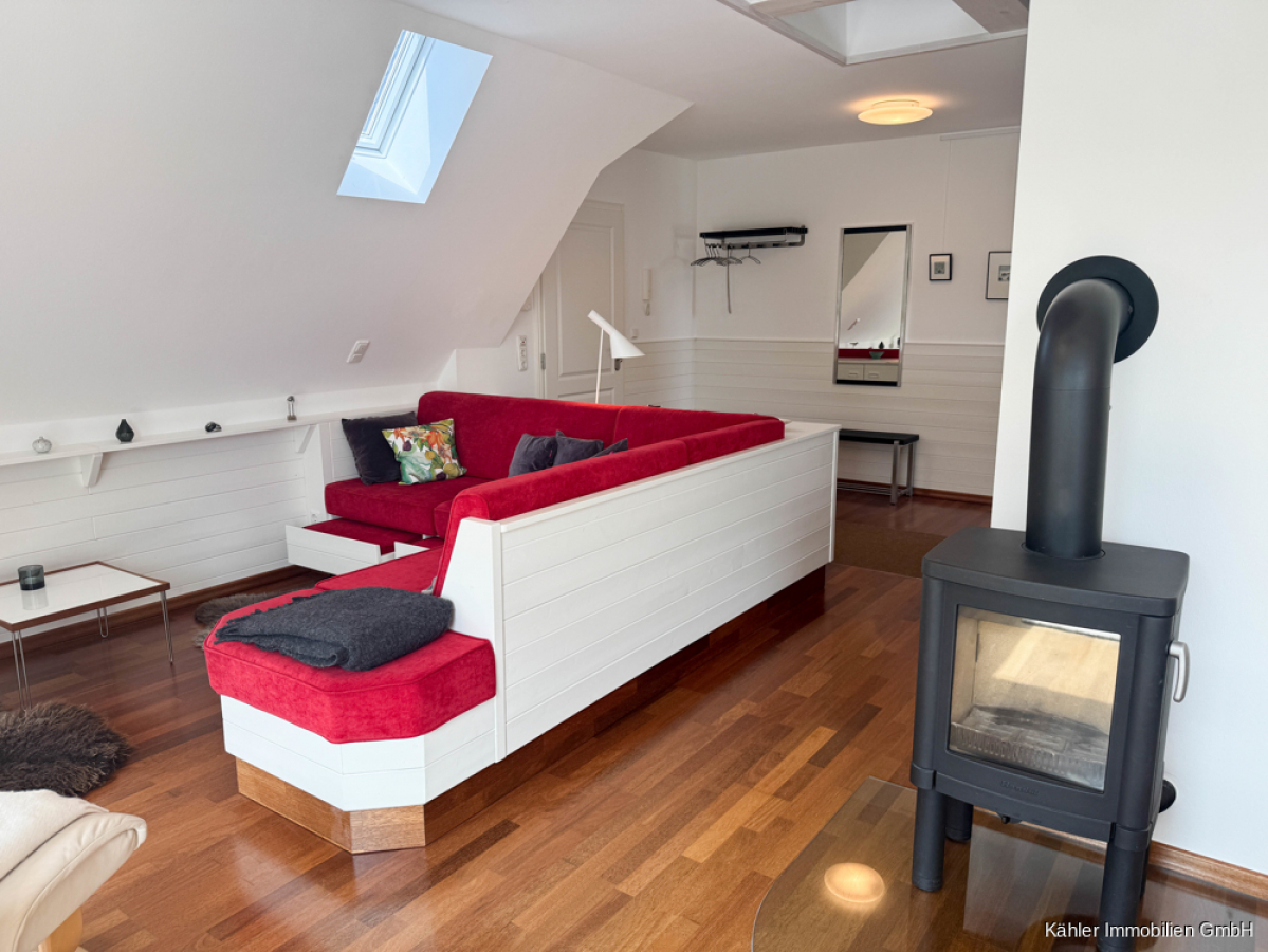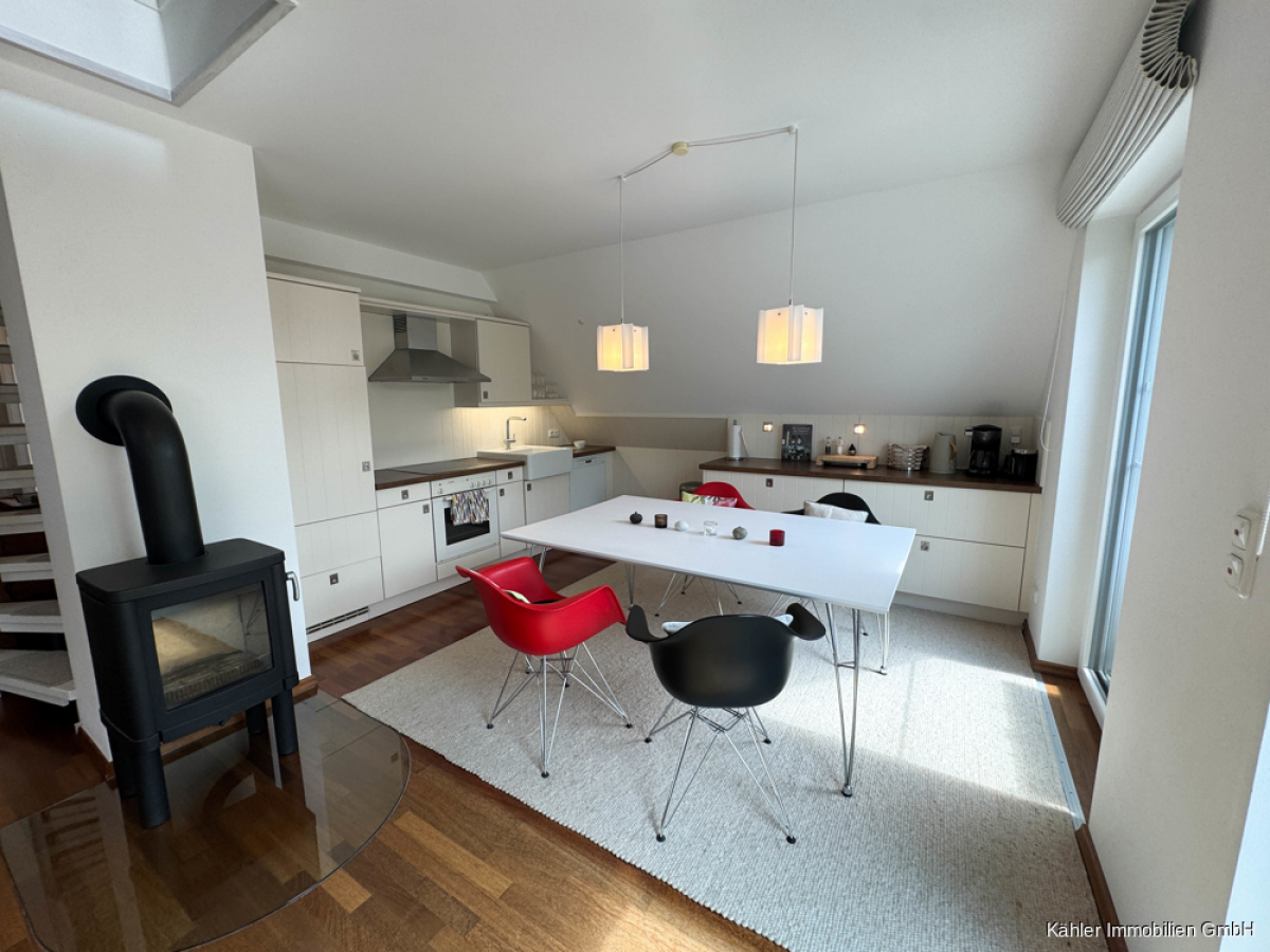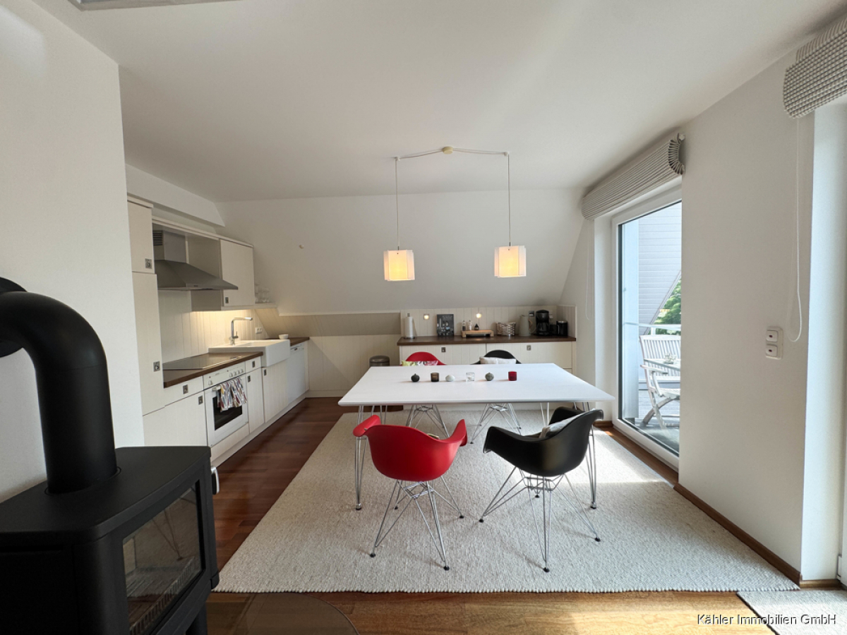 Wenn Sie in das Schwedenhaus eintreten, befinden Sie sich unmittelbar im Treppenhaus. Dieses ermöglicht den Zugang zu allen im Gebäude befindlichen Wohnungen.  Beim Eintreten in die Wohnung, die im ersten Obergeschoss liegt, finden Sie sich im Eingangsbereich wieder, welcher in den Wohn-, Ess- und Küchenbereich übergeht. Dieser zeichnet sich durch die helle und stilvolle Einrichtung aus. Hier finden Sie Leuchten von Arne Jacobsen und einen typisch dänischen, weißen Esstisch mit massiver Ahorntischplatte, sowie einen schwedischen Handoel-Kaminofen, der in den kalten Jahreszeiten angenehme Wärme spendet. Ein weiteres Highlight ist die individuell maßangefertigte Couchlandschaft mit einem Original-Finn-Juhl-Tisch. Die bodentiefen Fensterelemente lassen Tageslicht in den Raum und ermöglichen außerdem den Zugang zum Balkon, welcher durch seine Süd-West-Ausrichtung bei schönen Sonnenstunden zum Verweilen einlädt.
