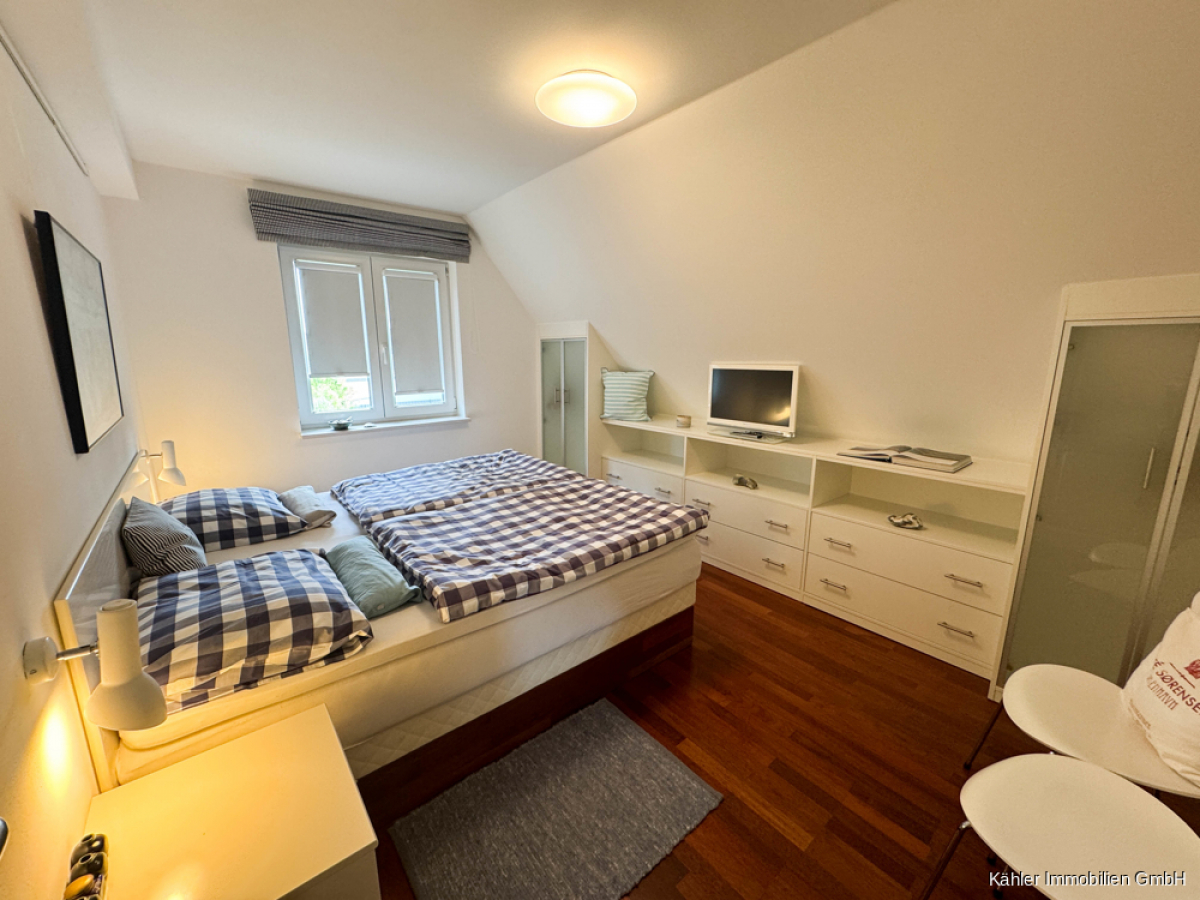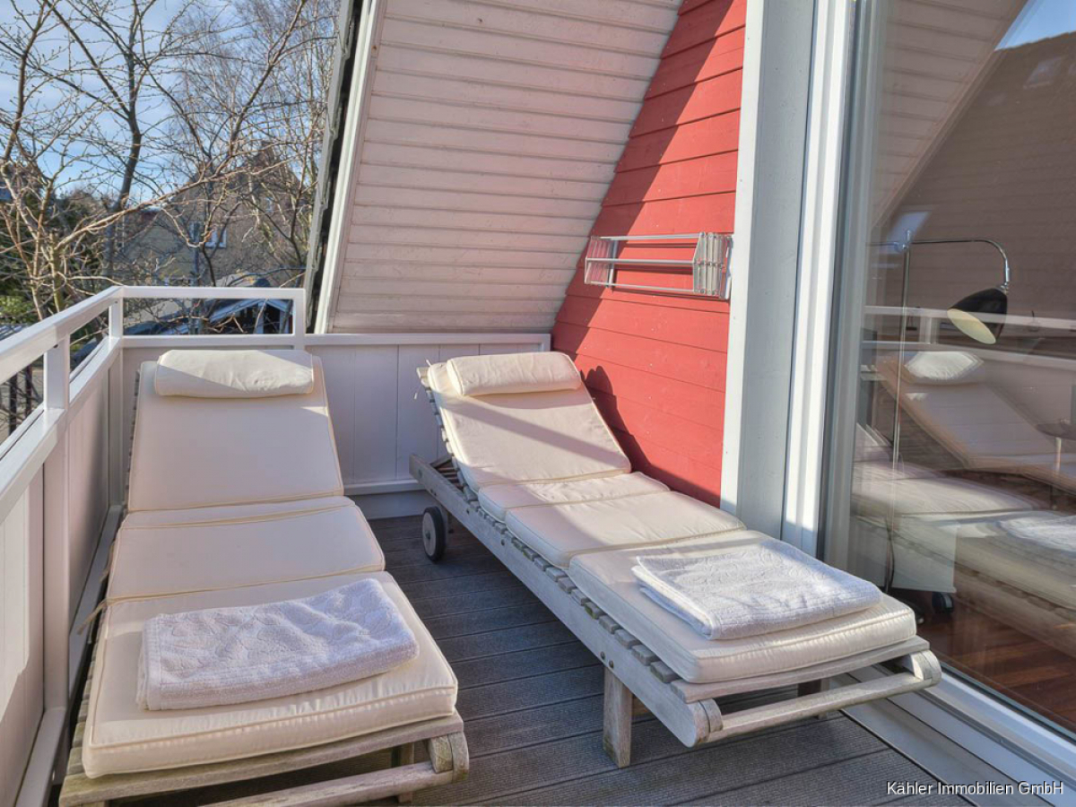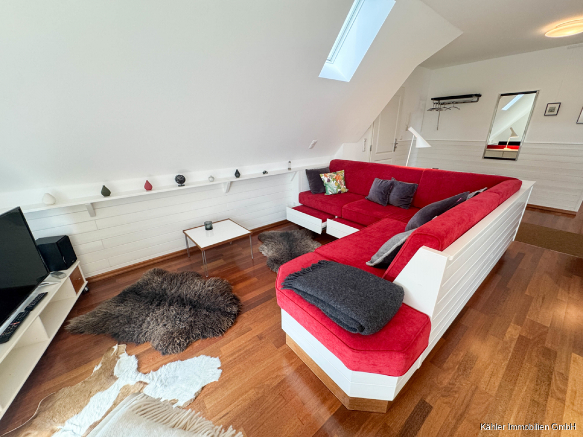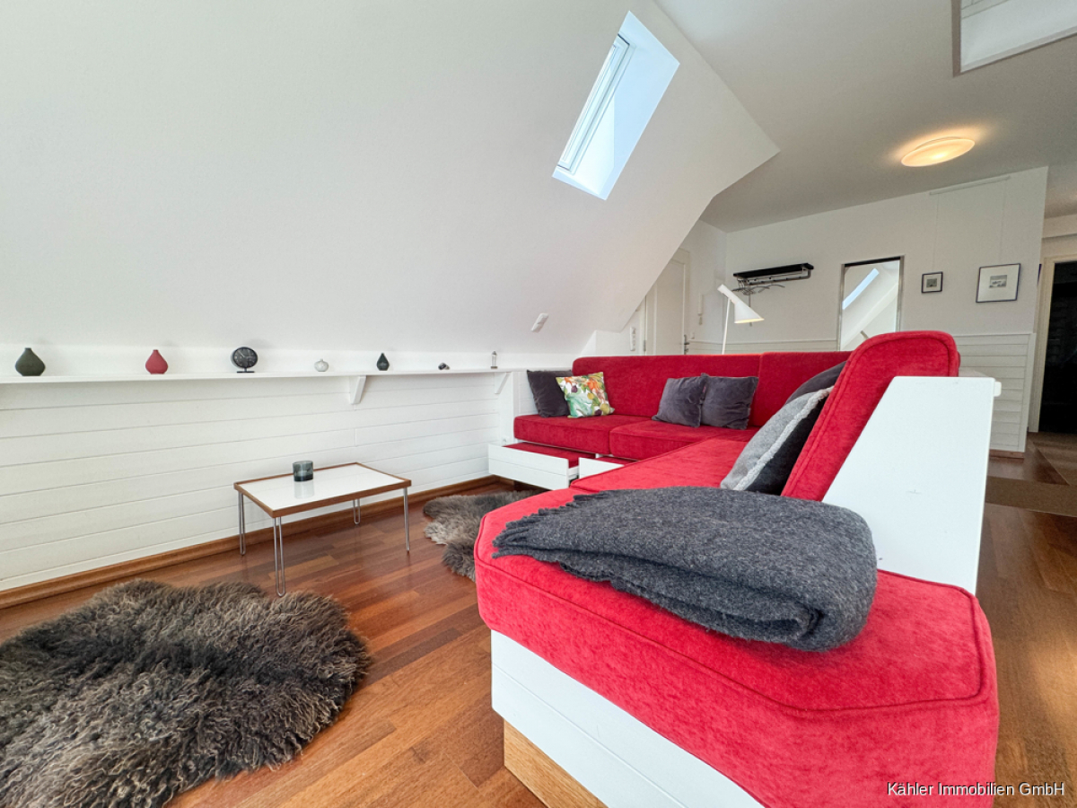 Wenn Sie in das Schwedenhaus eintreten, befinden Sie sich unmittelbar im Treppenhaus. Dieses ermöglicht den Zugang zu allen im Gebäude befindlichen Wohnungen.  Beim Eintreten in die Wohnung, die im ersten Obergeschoss liegt, finden Sie sich im Eingangsbereich wieder, welcher in den Wohn-, Ess- und Küchenbereich übergeht. Dieser zeichnet sich durch die helle und stilvolle Einrichtung aus. Hier finden Sie Leuchten von Arne Jacobsen und einen typisch dänischen, weißen Esstisch mit massiver Ahorntischplatte, sowie einen schwedischen Handoel-Kaminofen, der in den kalten Jahreszeiten angenehme Wärme spendet. Ein weiteres Highlight ist die individuell maßangefertigte Couchlandschaft mit einem Original-Finn-Juhl-Tisch. Die bodentiefen Fensterelemente lassen Tageslicht in den Raum und ermöglichen außerdem den Zugang zum Balkon, welcher durch seine Süd-West-Ausrichtung bei schönen Sonnenstunden zum Verweilen einlädt.