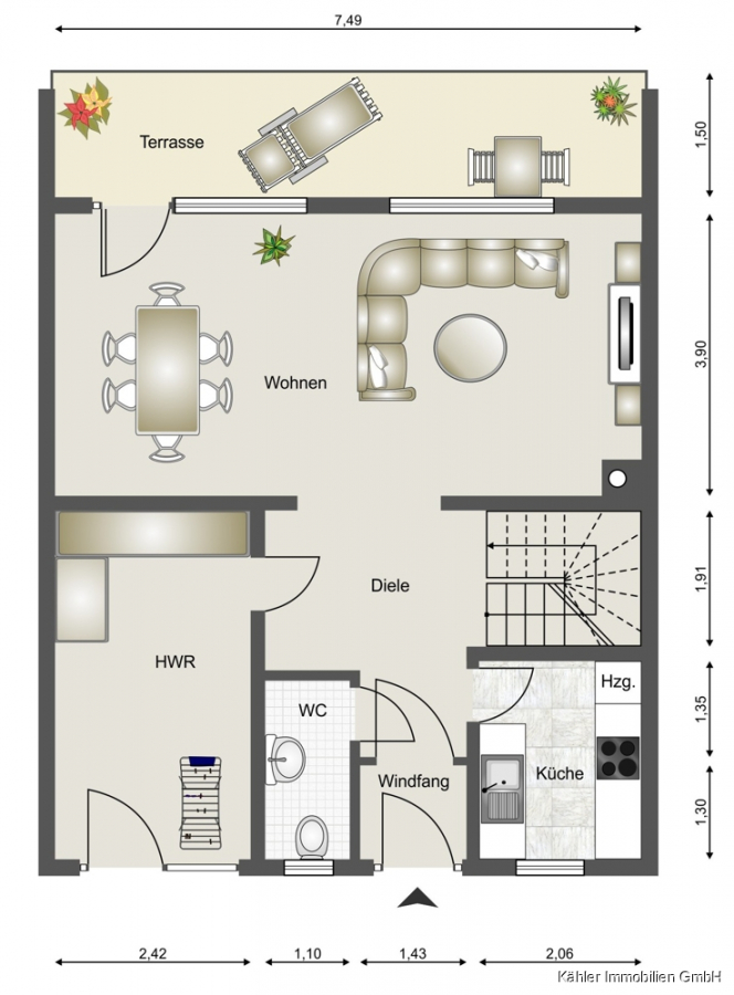 Im Erdgeschoss erwartet Sie ein großzügiger Wohn- und Essbereich, von dem aus sich die sonnige Westterrasse betreten lässt. Hier können Sie in privater Atmosphäre entspannen oder den Feierabend mit Familie und Freunden genießen. Die Terrasse geht in den pflegeleicht angelegten Garten über, der mit einer Gartenhütte zusätzlichen Stauraum für Geräte und Fahrräder bietet. Die moderne Küche im vorderen Bereich des Hauses bietet viel Platz zum Kochen. Ein Gäste-WC, ein Hauswirtschaftsraum mit Waschmaschinenanschluss sowie eine Garderobe im Eingangsbereich komplettieren die untere Etage.