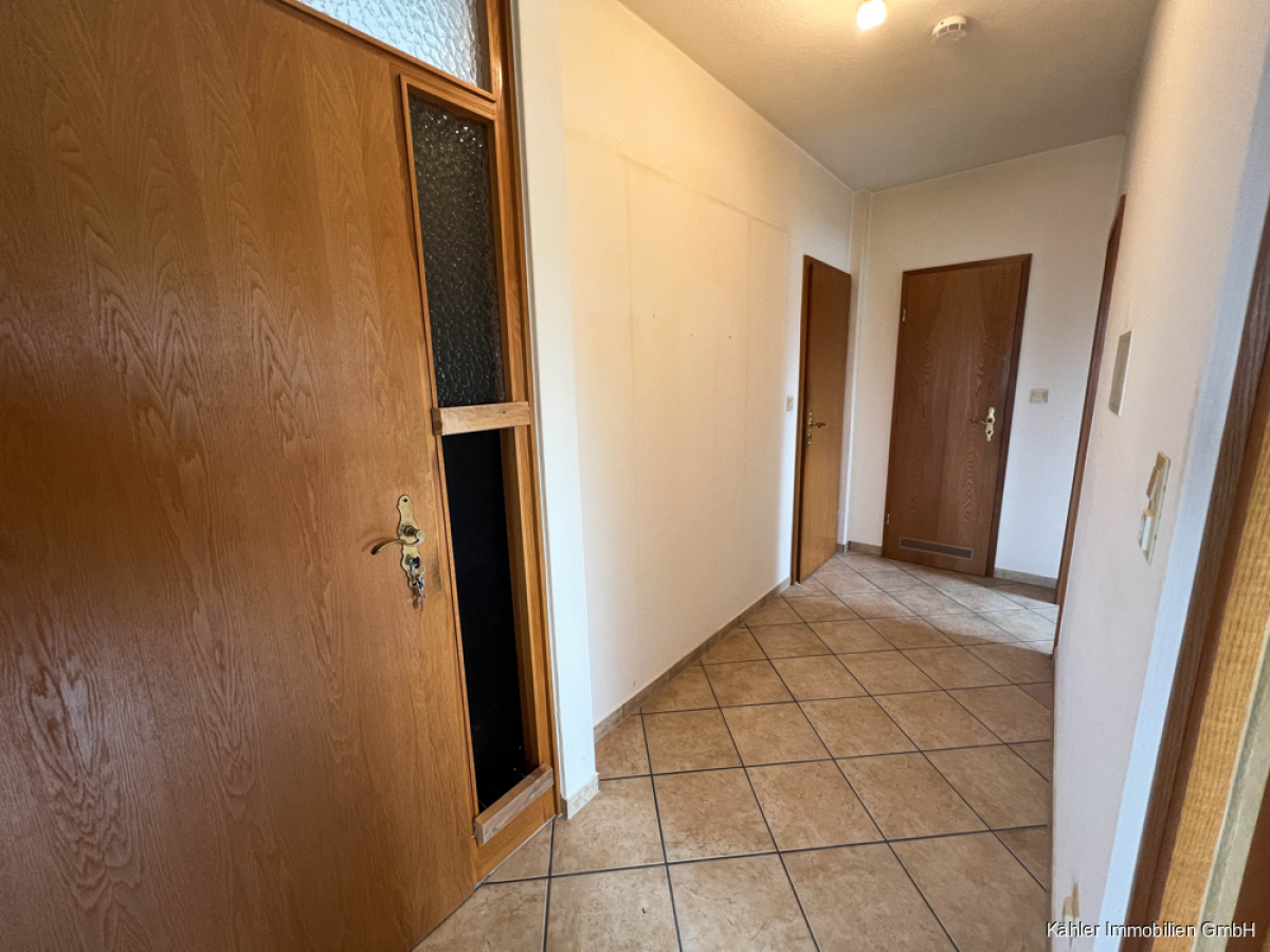 Die Wohnung ist über das gemeinschaftliche Treppenhaus zugänglich. Der Eingangsbereich in der ersten Etage führt über eine innenliegende Treppe direkt in den Wohnbereich. Der zentrale Flur verbindet alle Räume sinnvoll miteinander.