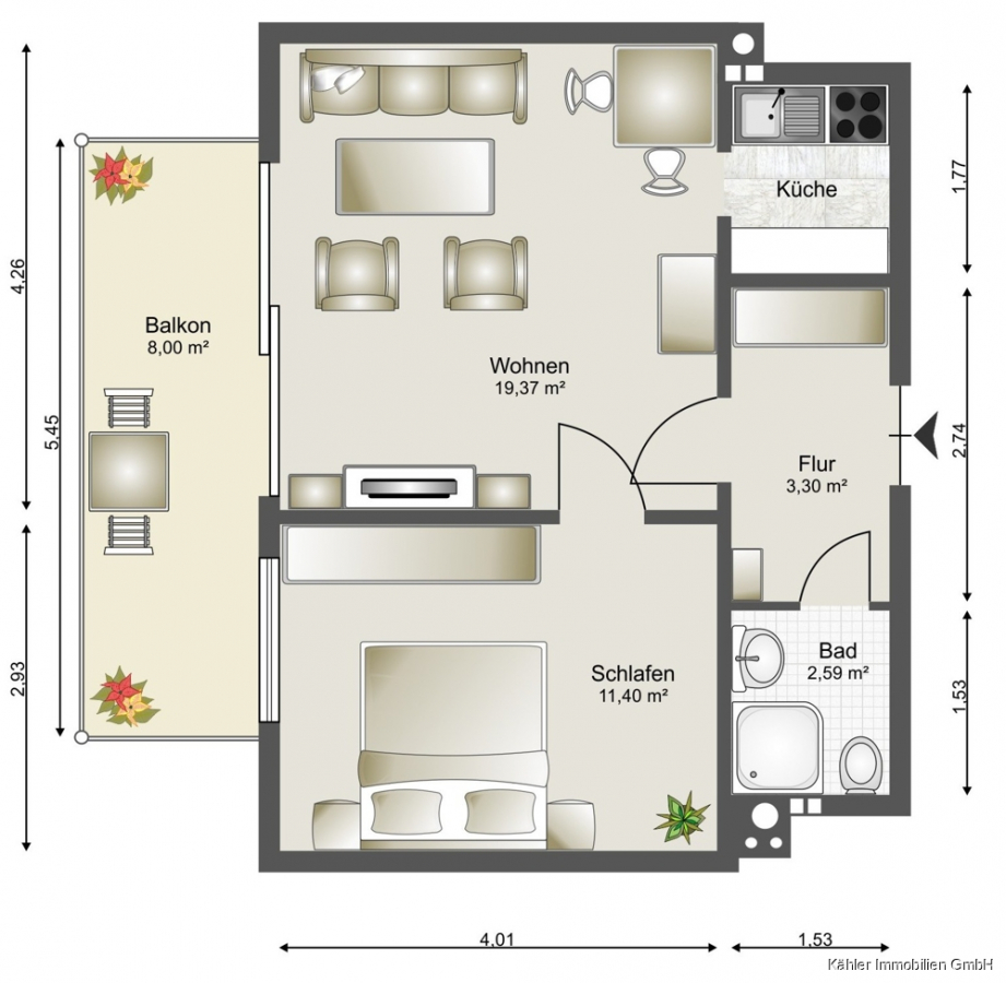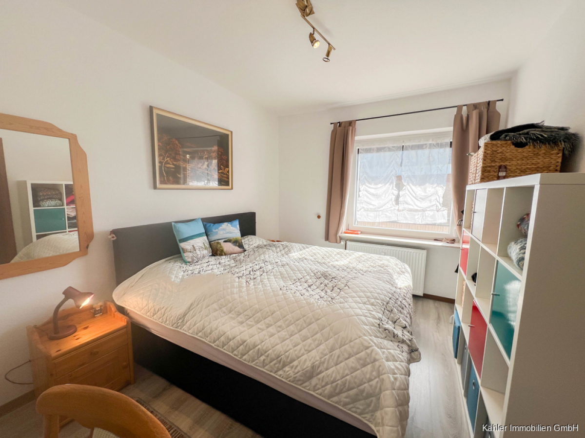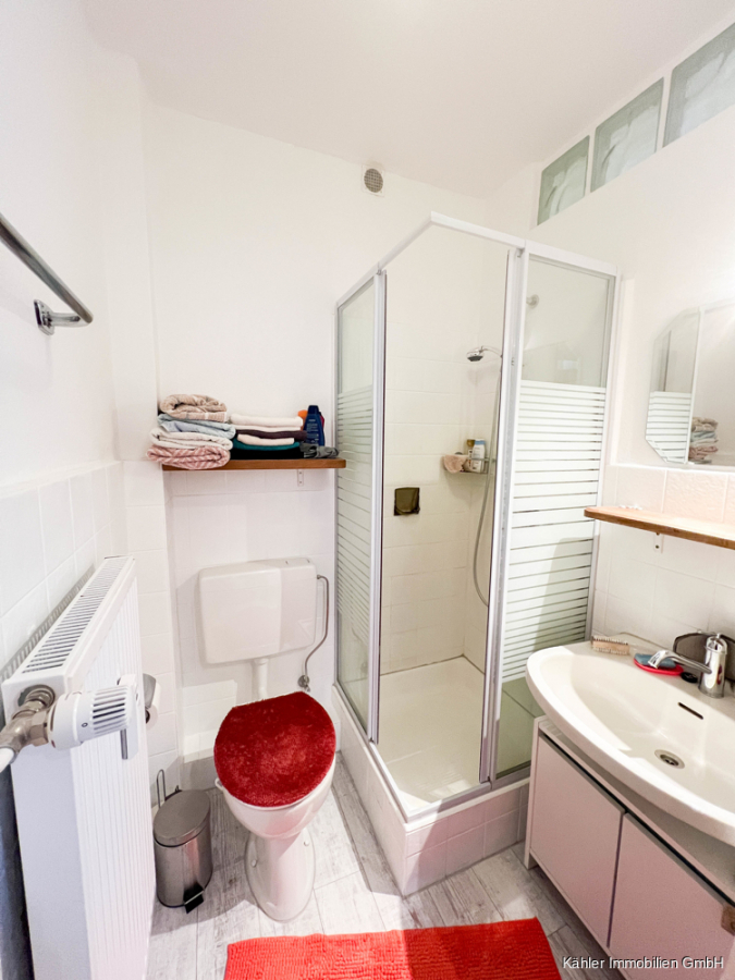 Unmittelbar an den Wohnbereich angrenzend, befindet sich das ca. 11,40 m² große Schlafzimmer. Ein gepflegtes Duschbadezimmer vervollständigt das Angebot.