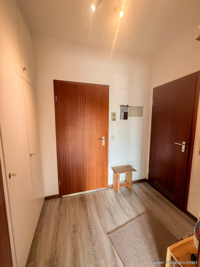 Über das Treppenhaus gelangen Sie in das Obergeschoss des Gebäudes. Durch die Eingangstür treten Sie in den Flur, der ausreichend Platz für eine Garderobe bietet.