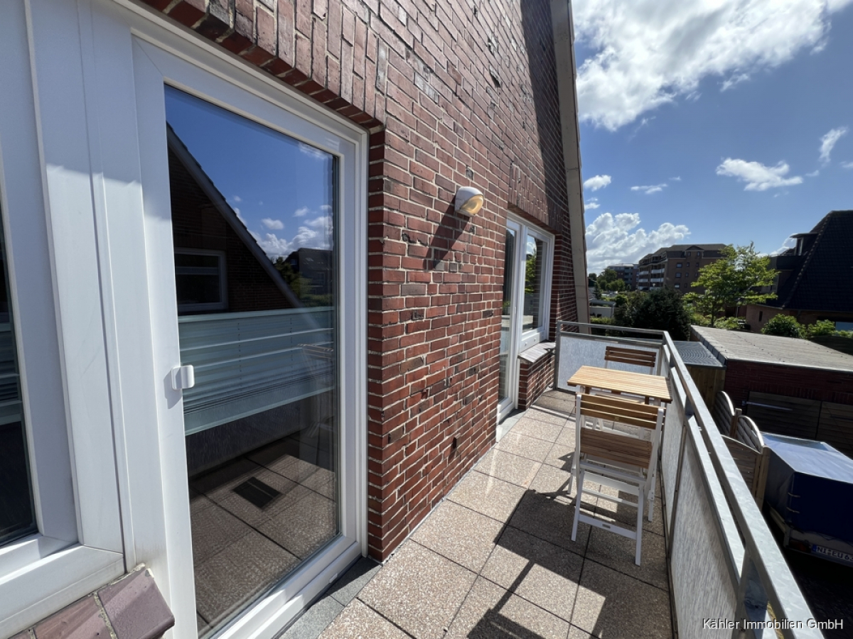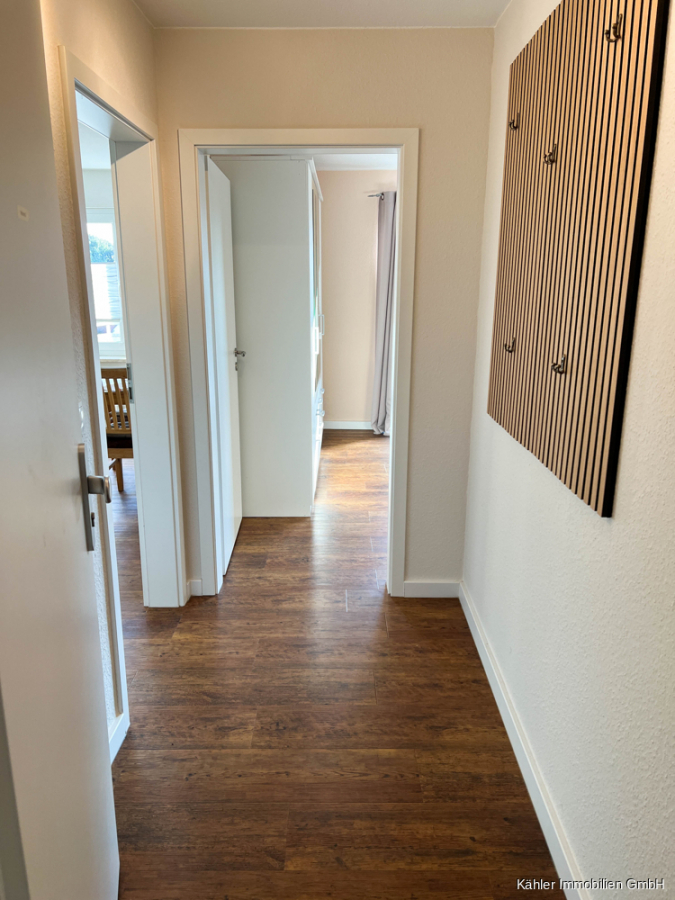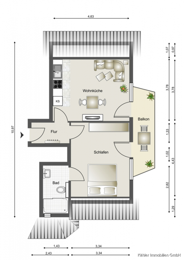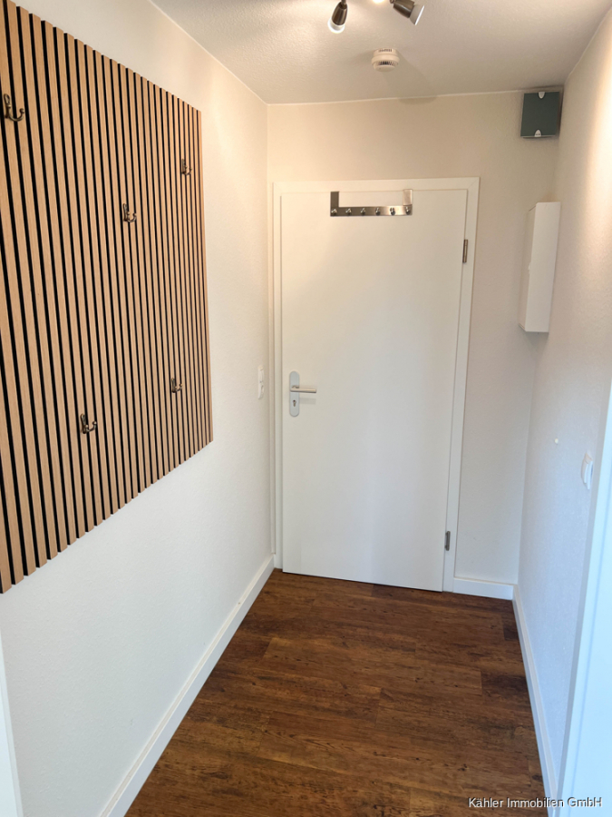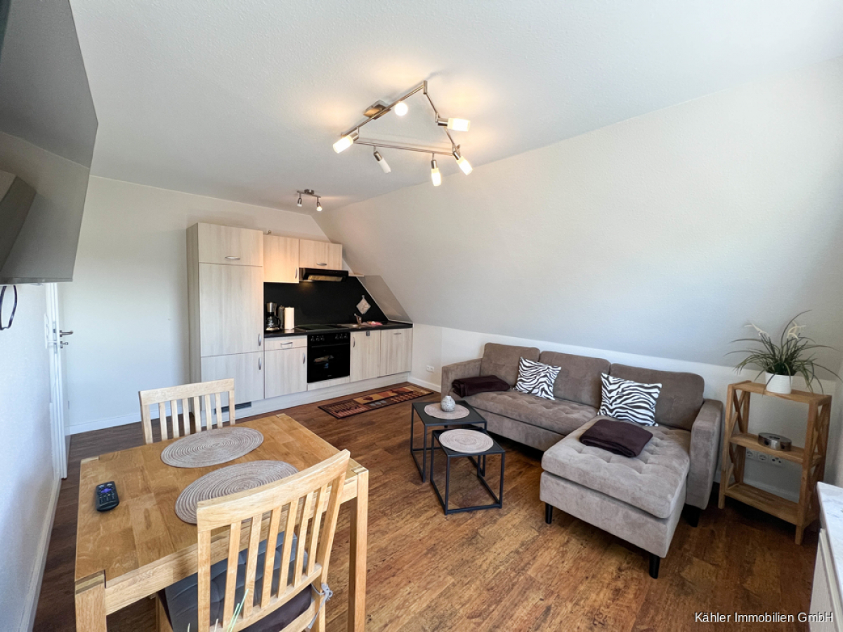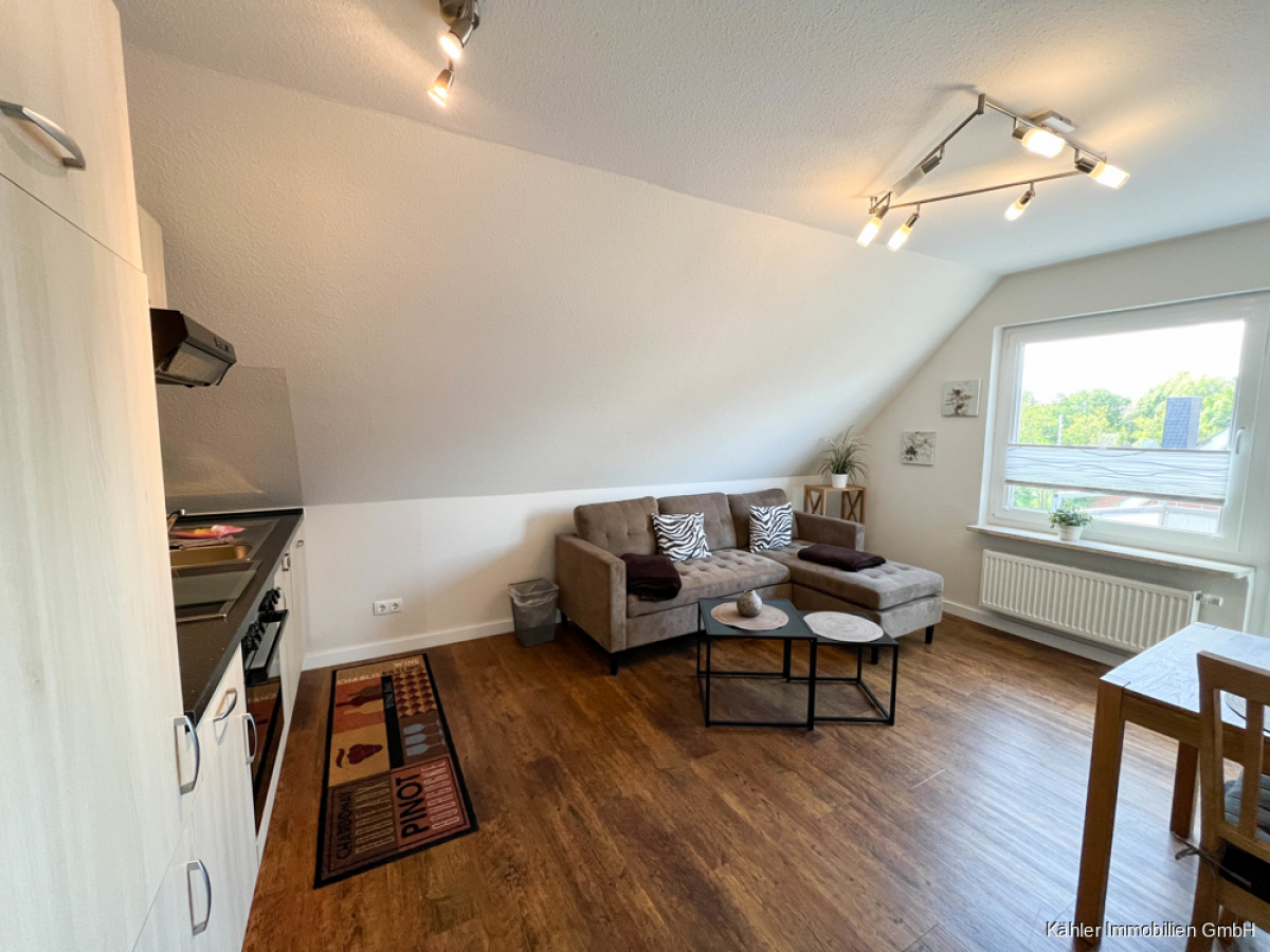 Über einen gemeinsamen Eingang im Erdgeschoss führt Sie eine Treppe in das Dachgeschoss zu der Wohnungseingangstür. Hier bietet die Wohnung einen kleinen Flur mit Platz für eine Garderobe, einen Wohnraum mit offener Küchenzeile und Zugang zum Südbalkon und ein Schlafzimmer mit einem Tageslichtduschbad. Auch das Schlafzimmer bietet einen Zugang zu dem sonnigen Südbalkon.