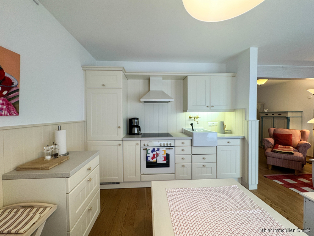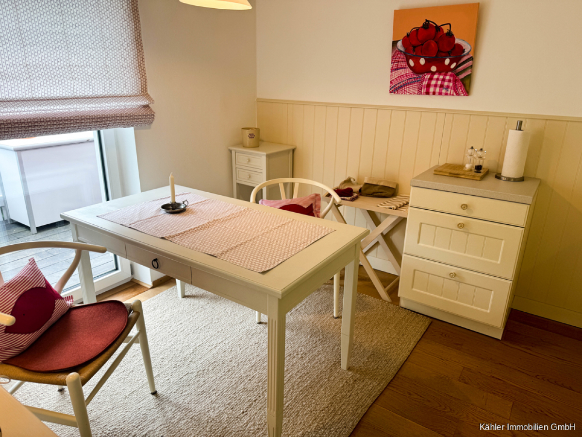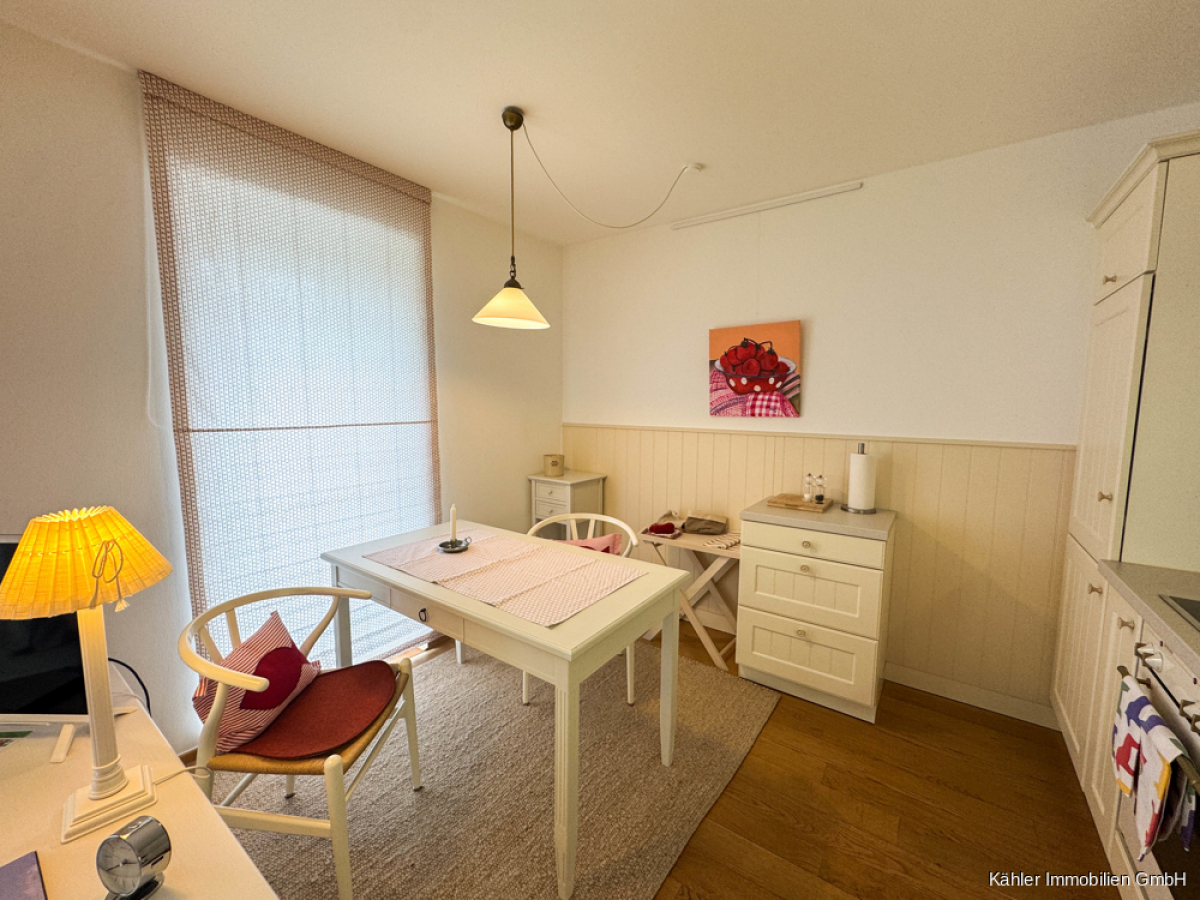 Der offene Wohn- und Essbereich beinhaltet die sandfarbene Küchenzeile der Wohnung. Dieser Bereich zeichnet sich besonders durch seine Helligkeit aus, welche durch die bodentiefen Fenstertüren begünstigt wird. Der gesamte Bereich ist hell, freundlich und stilvoll eingerichtet, unter anderem mit Möbeln der Firma Englestroem oder Lampen der Firma Berliner Messingleuchten. Über den Wohnbereich gelangen Sie auf die schöne, nach Südosten ausgerichtete ca. 7 m² große Veranda, welche durch den Sichtschutz in Form einer Vogelhecke bei Sonnenstunden zum Verweilen einlädt.