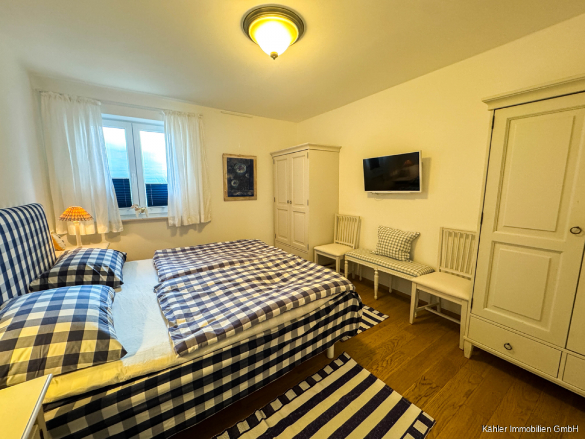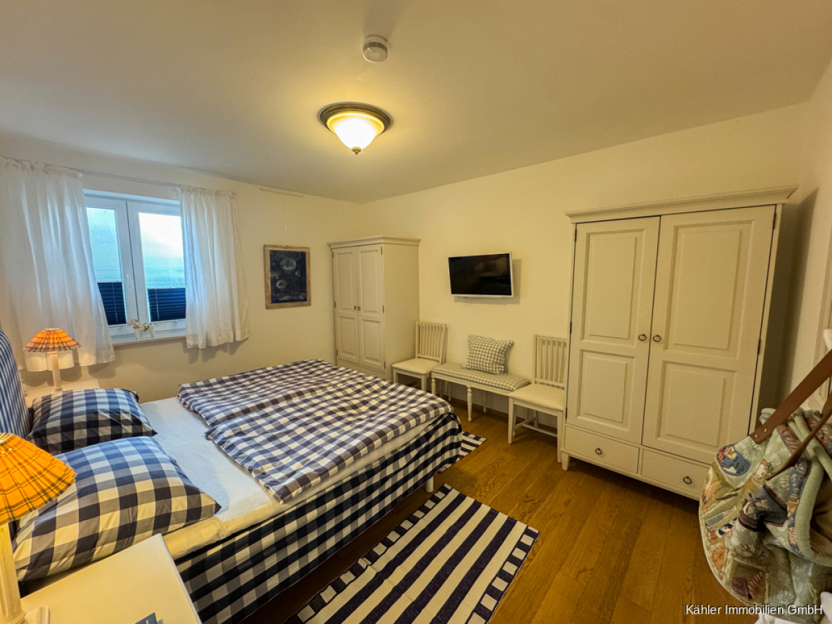 Das geräumige Schlafzimmer besticht besonders durch das Bett Marquis der schwedischen Bettmanufaktur Hästens. Hier befindet sich außerdem ein großer Kleiderschrank des schwedischen Möbelherstellers Englestroem, welcher zusätzlichen Stauraum bietet. In diesem Raum, sowie auch im Wohn- und Essbereich ist Echtholzfußboden in der Farbe Eiche hell verlegt.