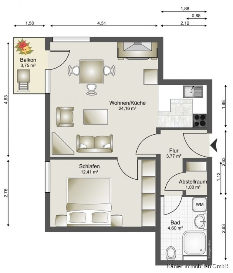 Die Wohnung erstreckt sich über ca. 47,52 m² Wohnfläche und bietet eine gut durchdachte Raumaufteilung mit einem offenen Wohn- und Essbereich, halboffener Küche sowie einem separaten Schlafzimmer. Der angrenzende südlich gelegene Balkon mit ca. 3,75 m² lädt zum Verweilen ein und wird zur Hälfte zur Wohnfläche hinzugerechnet. Das moderne Duschbad verfügt über einen Waschmaschinenanschluss, ein zusätzlicher Abstellraum in der Wohnung sorgt für praktischen Stauraum.