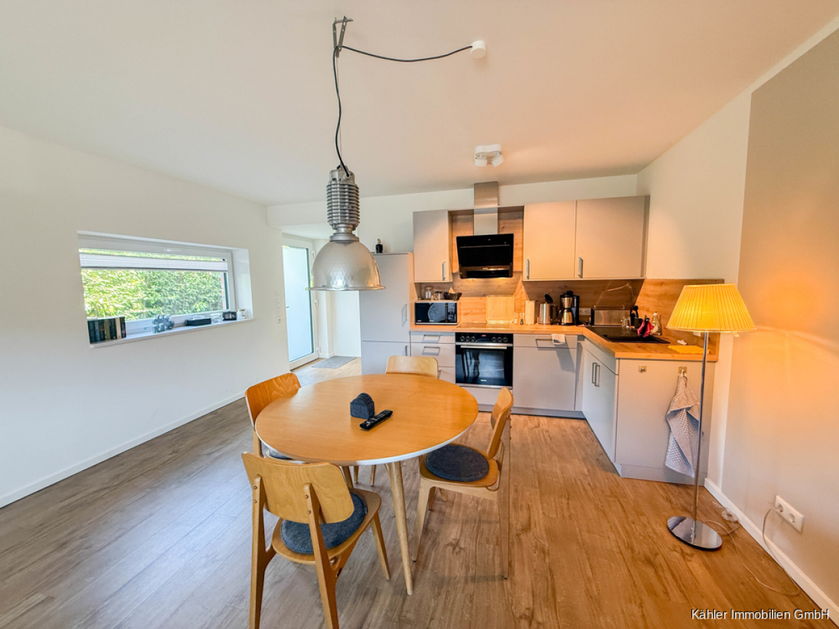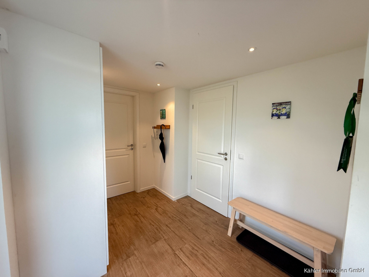 Durch die Eingangstür treten Sie unmittelbar in den einladenden Flur, welcher alle Räumlichkeiten im Erdgeschoss miteinander verbindet. Durch die durchdachte Raumaufteilung gelangen Sie in den offenen Wohn- und Essbereich und der offenen Küche, welche mit einer hochwertigen Ausstattung bestechen. Bodentiefe Fensterelemente verbinden hier den hellen großzügigen Wohnbereich mit dem ca. 3,44 m² südlich gelegenen Balkon, welcher bei schönen Sonnenstunden zum Verweilen einlädt und mit einem Strandkorb bezaubert.