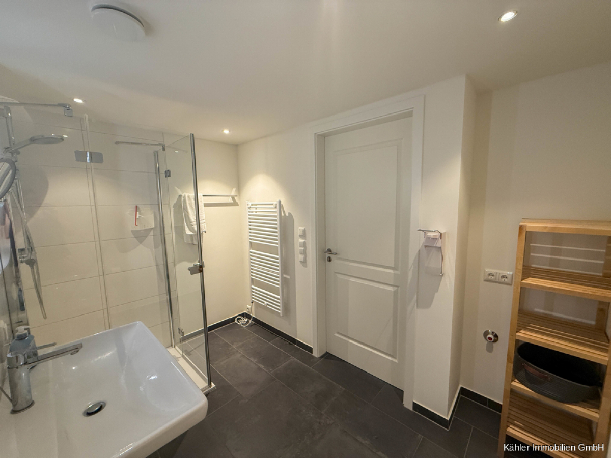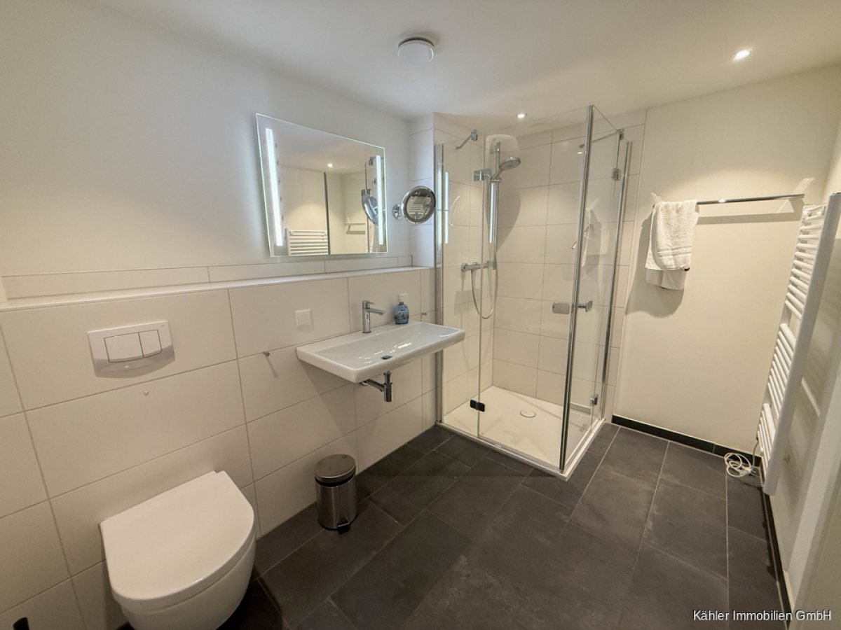 Ein hochwertiges Badezimmer mit einer ebenerdigen Walk-In Dusche sowie einem Waschmaschinenanschluss runden das Angebot ab.