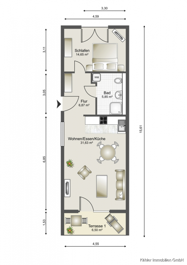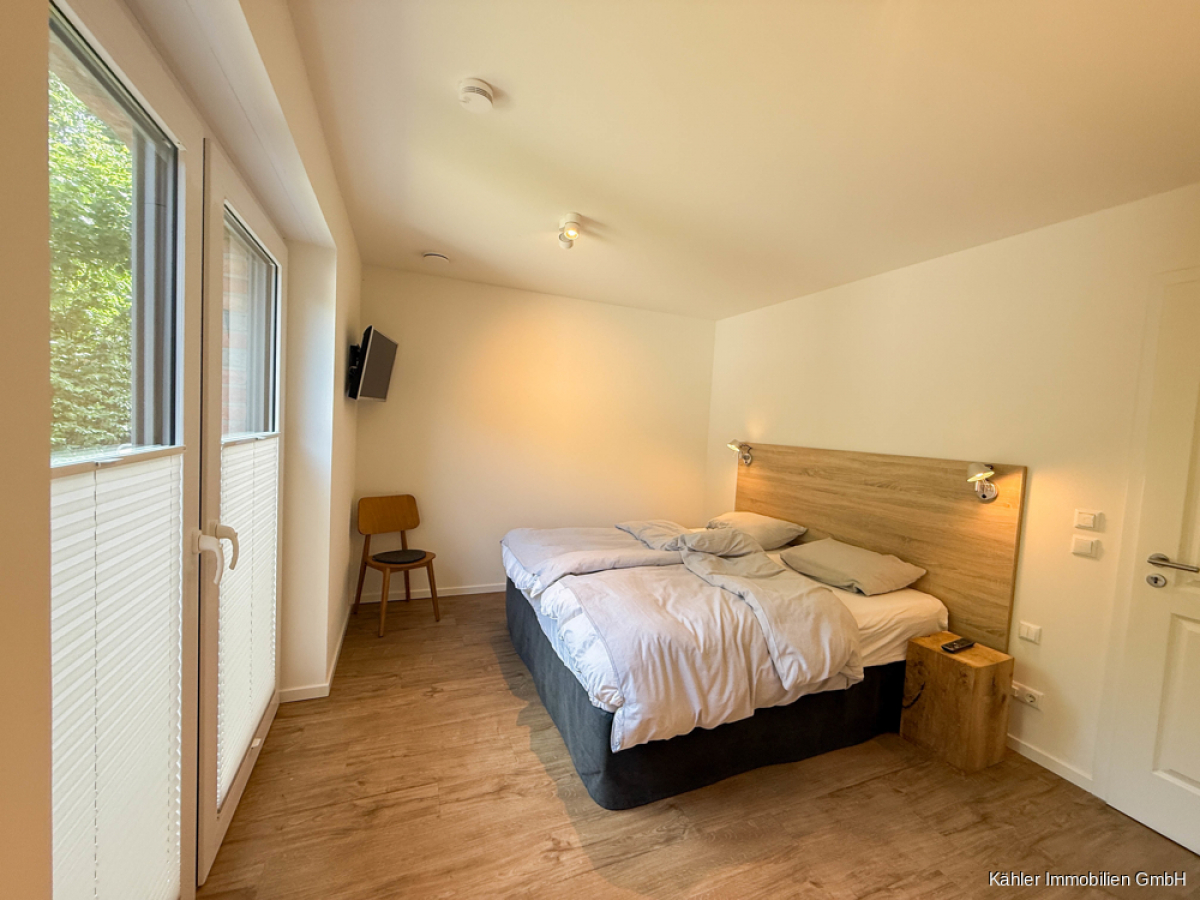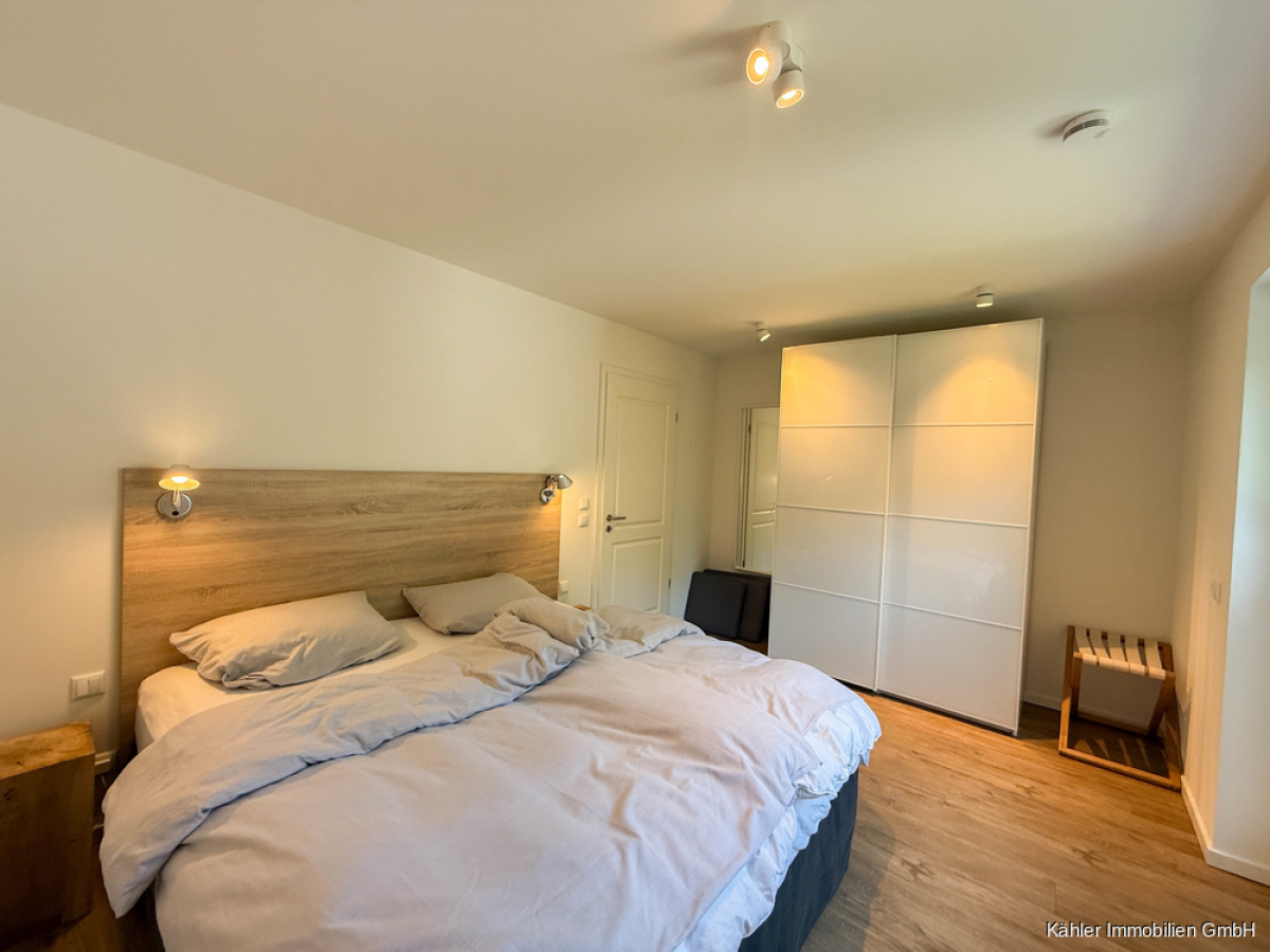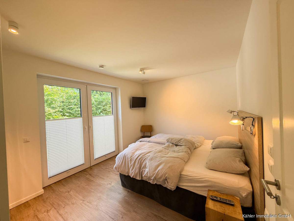 An den Wohnbereich angrenzend befindet sich ein ca. 14,65 m² großzügiges Schlafzimmer mit großen hellen Fensterelementen, welche Ihnen einen Blick ins Grüne eröffnen.